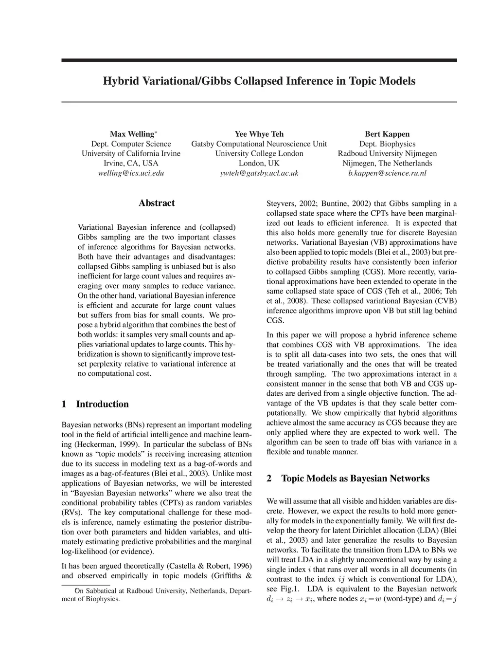 Hybrid Variational/Gibbs Collapsed Inference in Topic Models