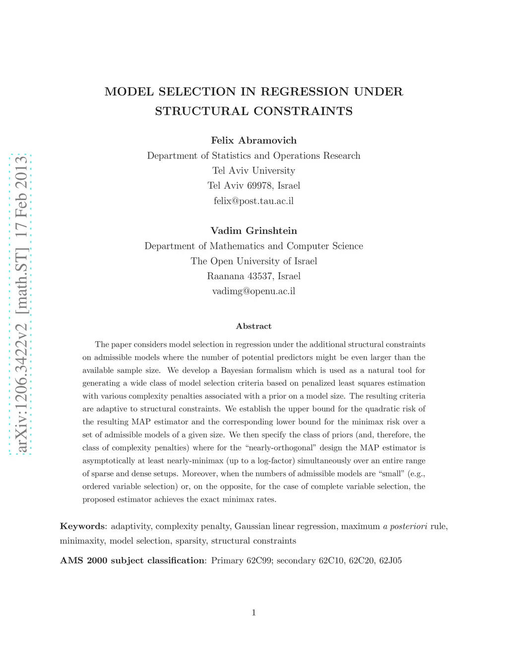 The paper considers model selection in regression under the additional structural constraints on admissible models where the number of potential predictors might be even larger than the available sample size. We develop a Bayesian formalism as a natural tool for generating a wide class of model selection criteria based on penalized least squares estimation with various complexity penalties associated with a prior on a model size. The resulting criteria are adaptive to structural constraints. We establish the upper bound for the quadratic risk of the resulting MAP estimator and the corresponding lower bound for the minimax risk over a set of admissible models of a given size. We then specify the class of priors (and, therefore, the class of complexity penalties) where for the "nearly-orthogonal" design the MAP estimator is asymptotically at least nearly-minimax (up to a log-factor) simultaneously over an entire range of sparse and dense setups. Moreover, when the numbers of admissible models are "small" (e.g., ordered variable selection) or, on the opposite, for the case of complete variable selection, the proposed estimator achieves the exact minimax rates.
