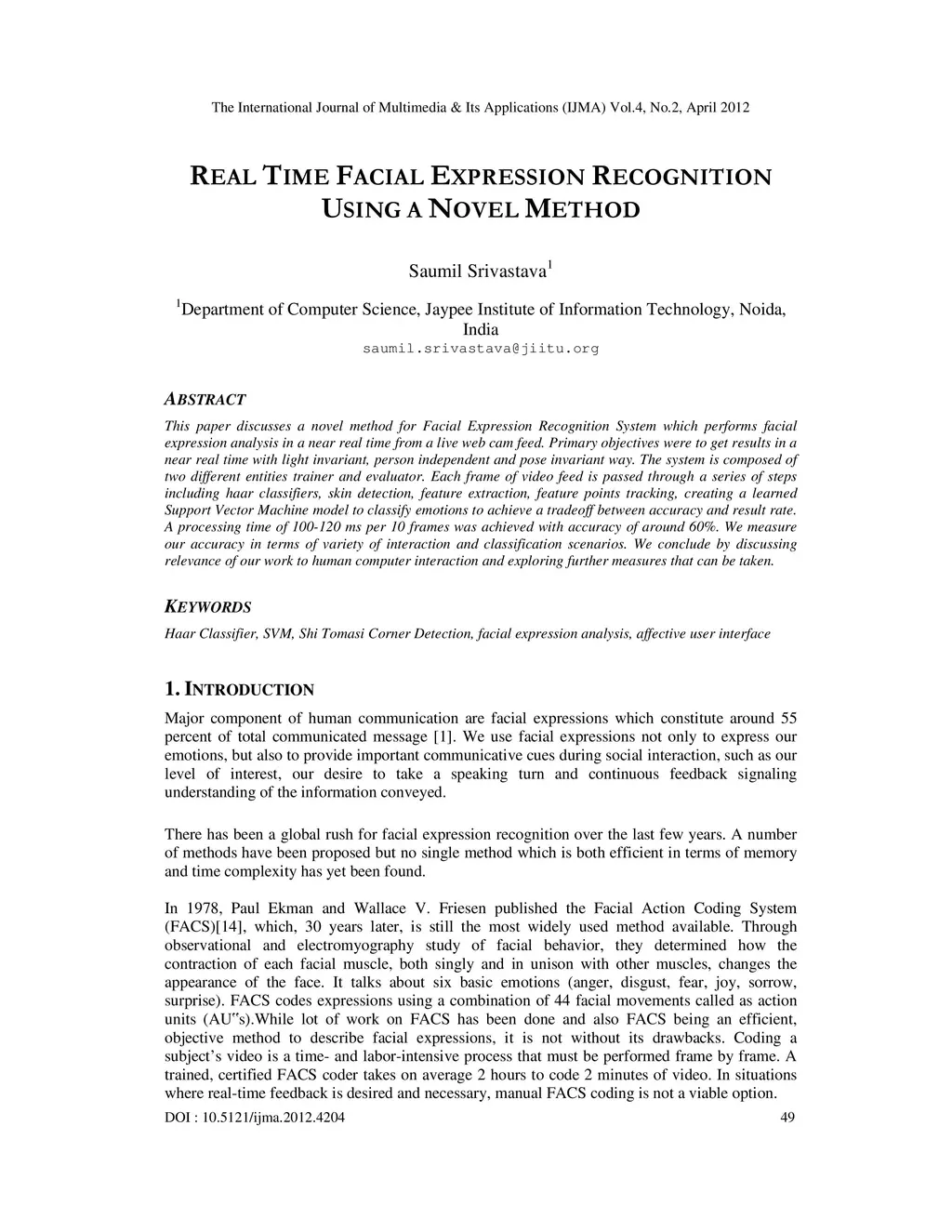 Real time facial expression recognition using a novel method