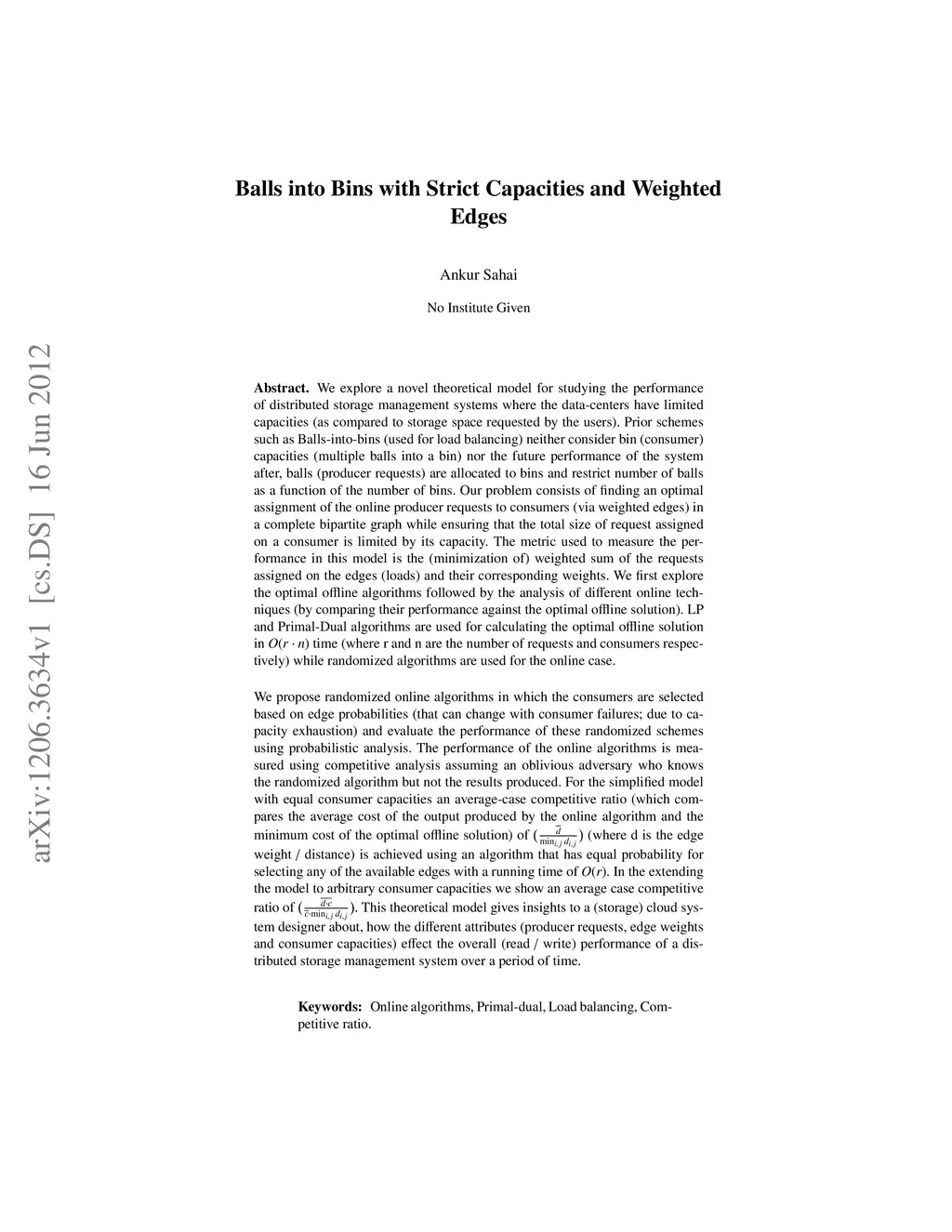We explore a novel theoretical model for studying the performance of distributed storage management systems where the data-centers have limited capacities (as compared to storage space requested by the users). Prior schemes such as Balls-into-bins (used for load balancing) neither consider bin (consumer) capacities (multiple balls into a bin) nor the future performance of the system after, balls (producer requests) are allocated to bins and restrict number of balls as a function of the number of bins. Our problem consists of finding an optimal assignment of the online producer requests to consumers (via weighted edges) in a complete bipartite graph while ensuring that the total size of request assigned on a consumer is limited by its capacity. The metric used to measure the performance in this model is the (minimization of) weighted sum of the requests assigned on the edges (loads) and their corresponding weights. We first explore the optimal offline algorithms followed by competitive analysis of different online techniques. Using oblivious adversary. LP and Primal-Dual algorithms are used for calculating the optimal offline solution in O(r*n) time (where r and n are the number of requests and consumers respectively) while randomized algorithms are used for the online case. For the simplified model with equal consumer capacities an average-case competitive ratio of AVG(d) / MIN(d) (where d is the edge weight / distance) is achieved using an algorithm that has equal probability for selecting any of the available edges with a running time of . In the extending the model to arbitrary consumer capacities we show an average case competitive ratio of AVG(d*c) / (AVG(c) *MIN(d)).