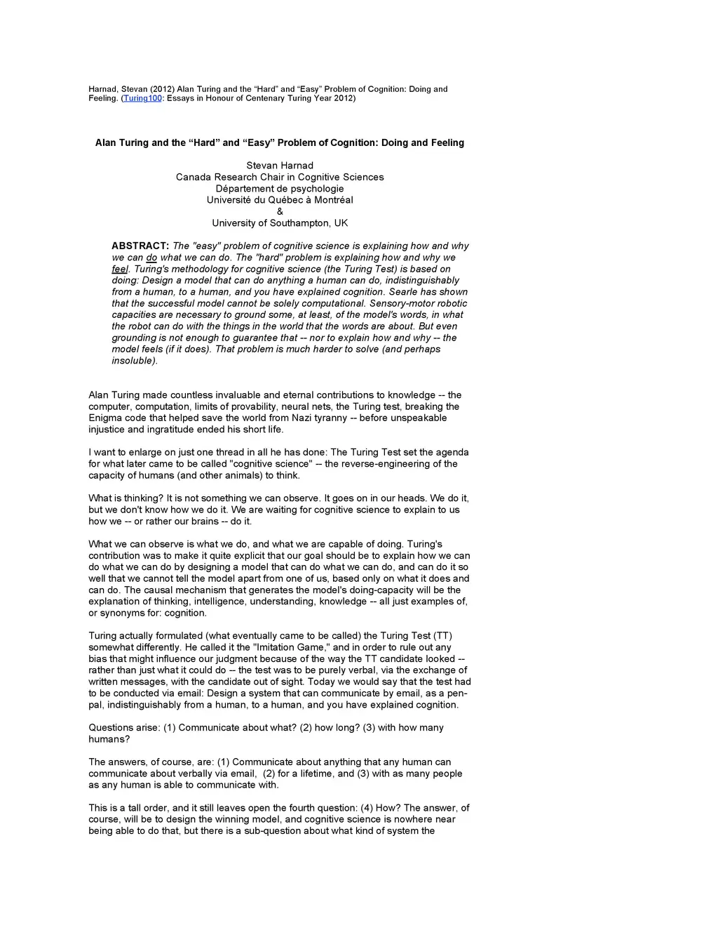 The "easy" problem of cognitive science is explaining how and why we can do what we can do. The "hard" problem is explaining how and why we feel. Turing's methodology for cognitive science (the Turing Test) is based on doing: Design a model that can do anything a human can do, indistinguishably from a human, to a human, and you have explained cognition. Searle has shown that the successful model cannot be solely computational. Sensory-motor robotic capacities are necessary to ground some, at least, of the model's words, in what the robot can do with the things in the world that the words are about. But even grounding is not enough to guarantee that -- nor to explain how and why -- the model feels (if it does). That problem is much harder to solve (and perhaps insoluble).