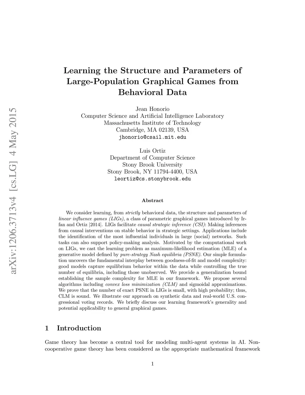 We consider learning, from strictly behavioral data, the structure and parameters of linear influence games (LIGs), a class of parametric graphical games introduced by Irfan and Ortiz (2014). LIGs facilitate causal strategic inference (CSI): Making inferences from causal interventions on stable behavior in strategic settings. Applications include the identification of the most influential individuals in large (social) networks. Such tasks can also support policy-making analysis. Motivated by the computational work on LIGs, we cast the learning problem as maximum-likelihood estimation (MLE) of a generative model defined by pure-strategy Nash equilibria (PSNE). Our simple formulation uncovers the fundamental interplay between goodness-of-fit and model complexity: good models capture equilibrium behavior within the data while controlling the true number of equilibria, including those unobserved. We provide a generalization bound establishing the sample complexity for MLE in our framework. We propose several algorithms including convex loss minimization (CLM) and sigmoidal approximations. We prove that the number of exact PSNE in LIGs is small, with high probability; thus, CLM is sound. We illustrate our approach on synthetic data and real-world U.S. congressional voting records. We briefly discuss our learning framework's generality and potential applicability to general graphical games.