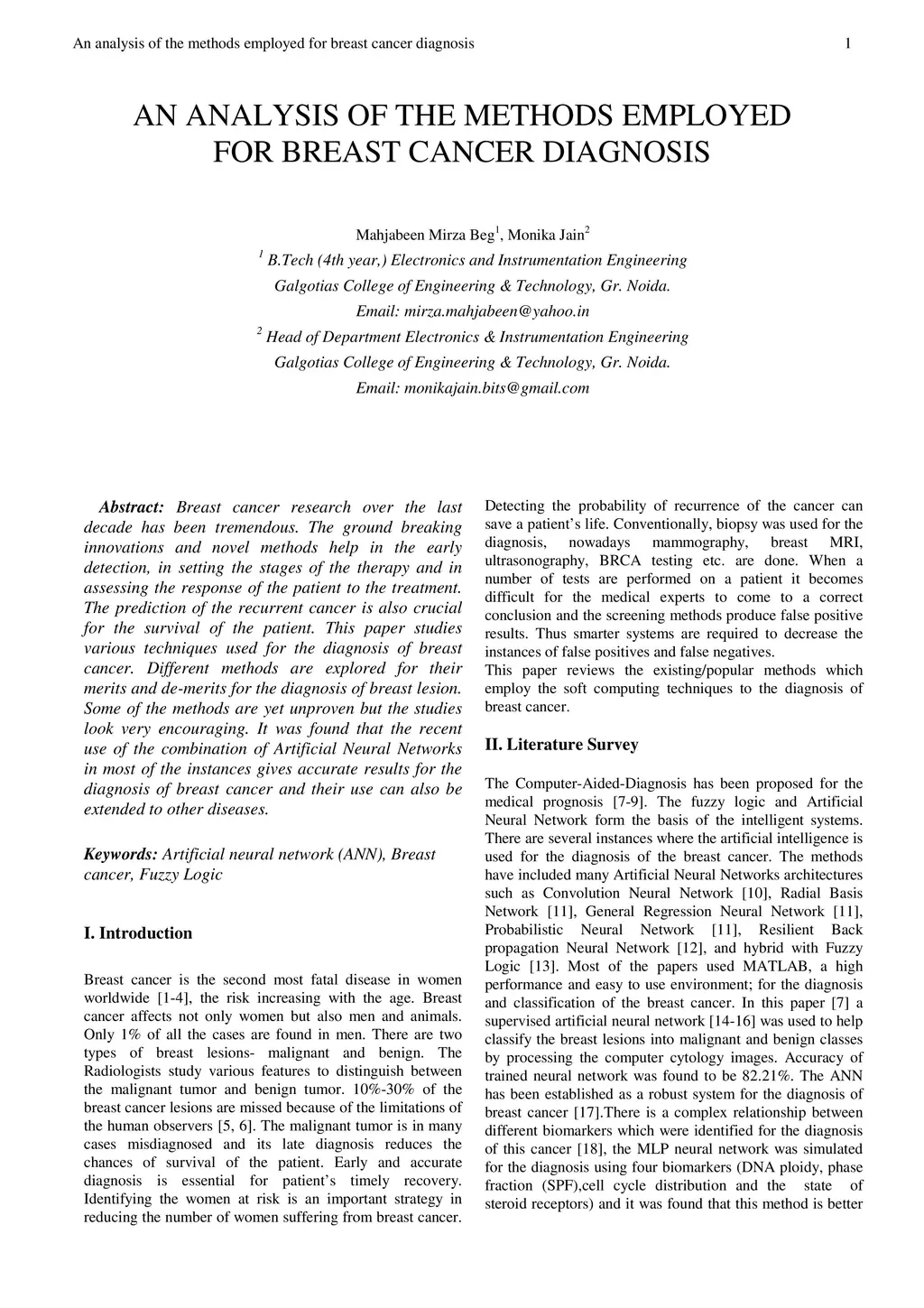 Breast cancer research over the last decade has been tremendous. The ground breaking innovations and novel methods help in the early detection, in setting the stages of the therapy and in assessing the response of the patient to the treatment. The prediction of the recurrent cancer is also crucial for the survival of the patient. This paper studies various techniques used for the diagnosis of breast cancer. Different methods are explored for their merits and de-merits for the diagnosis of breast lesion. Some of the methods are yet unproven but the studies look very encouraging. It was found that the recent use of the combination of Artificial Neural Networks in most of the instances gives accurate results for the diagnosis of breast cancer and their use can also be extended to other diseases.