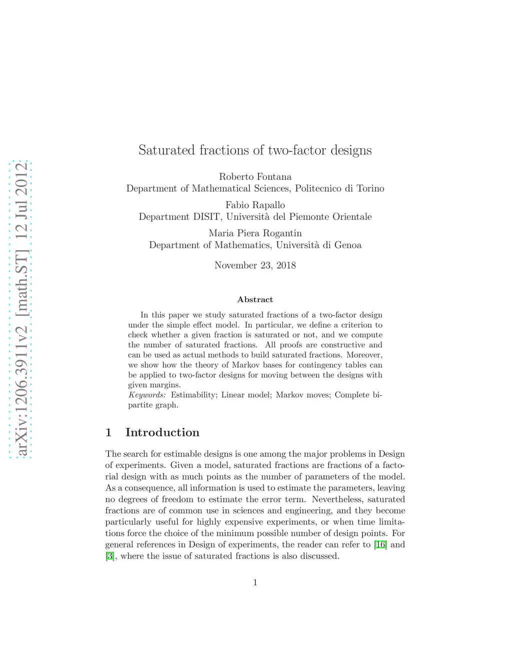 In this paper we study saturated fractions of a two-factor design under the simple effect model. In particular, we define a criterion to check whether a given fraction is saturated or not, and we compute the number of saturated fractions. All proofs are constructive and can be used as actual methods to build saturated fractions. Moreover, we show how the theory of Markov bases for contingency tables can be applied to two-factor designs for moving between the designs with given margins.