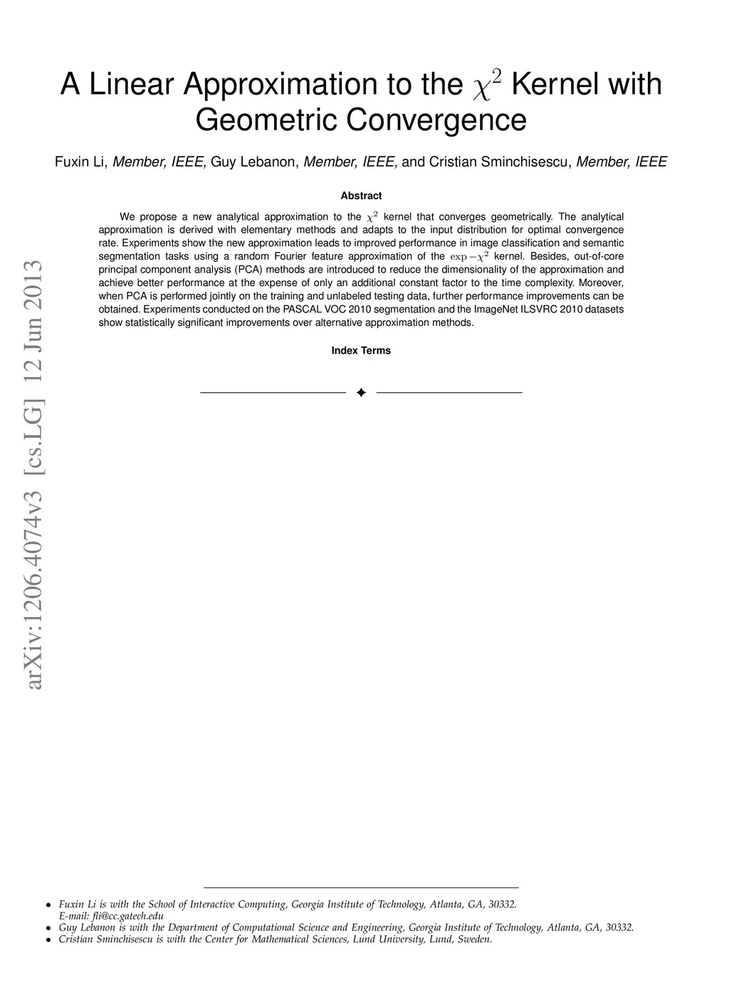 We propose a new analytical approximation to the kernel that converges geometrically. The analytical approximation is derived with elementary methods and adapts to the input distribution for optimal convergence rate. Experiments show the new approximation leads to improved performance in image classification and semantic segmentation tasks using a random Fourier feature approximation of the kernel. Besides, out-of-core principal component analysis (PCA) methods are introduced to reduce the dimensionality of the approximation and achieve better performance at the expense of only an additional constant factor to the time complexity. Moreover, when PCA is performed jointly on the training and unlabeled testing data, further performance improvements can be obtained. Experiments conducted on the PASCAL VOC 2010 segmentation and the ImageNet ILSVRC 2010 datasets show statistically significant improvements over alternative approximation methods.