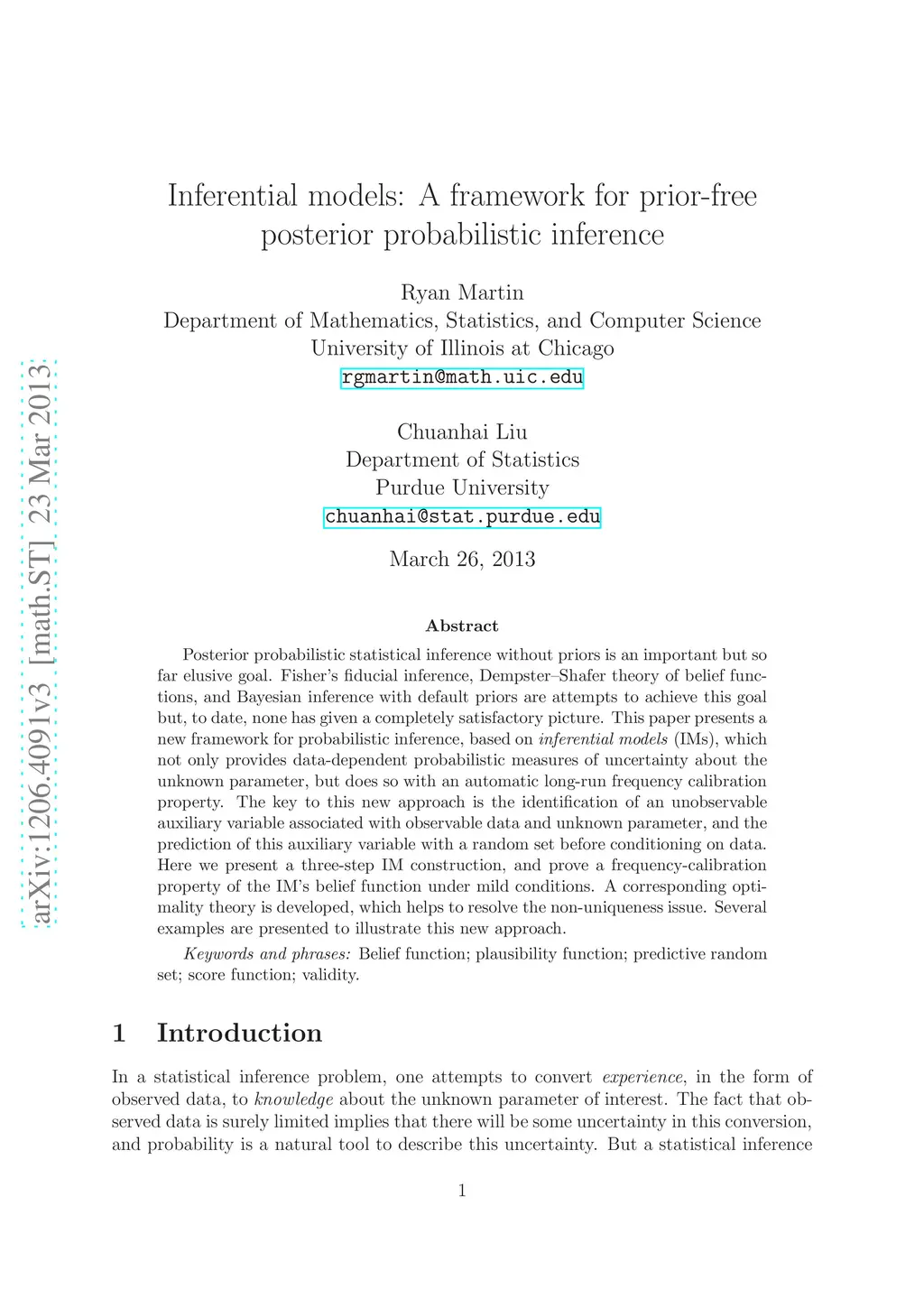 Posterior probabilistic statistical inference without priors is an important but so far elusive goal. Fisher's fiducial inference, Dempster-Shafer theory of belief functions, and Bayesian inference with default priors are attempts to achieve this goal but, to date, none has given a completely satisfactory picture. This paper presents a new framework for probabilistic inference, based on inferential models (IMs), which not only provides data-dependent probabilistic measures of uncertainty about the unknown parameter, but does so with an automatic long-run frequency calibration property. The key to this new approach is the identification of an unobservable auxiliary variable associated with observable data and unknown parameter, and the prediction of this auxiliary variable with a random set before conditioning on data. Here we present a three-step IM construction, and prove a frequency-calibration property of the IM's belief function under mild conditions. A corresponding optimality theory is developed, which helps to resolve the non-uniqueness issue. Several examples are presented to illustrate this new approach.