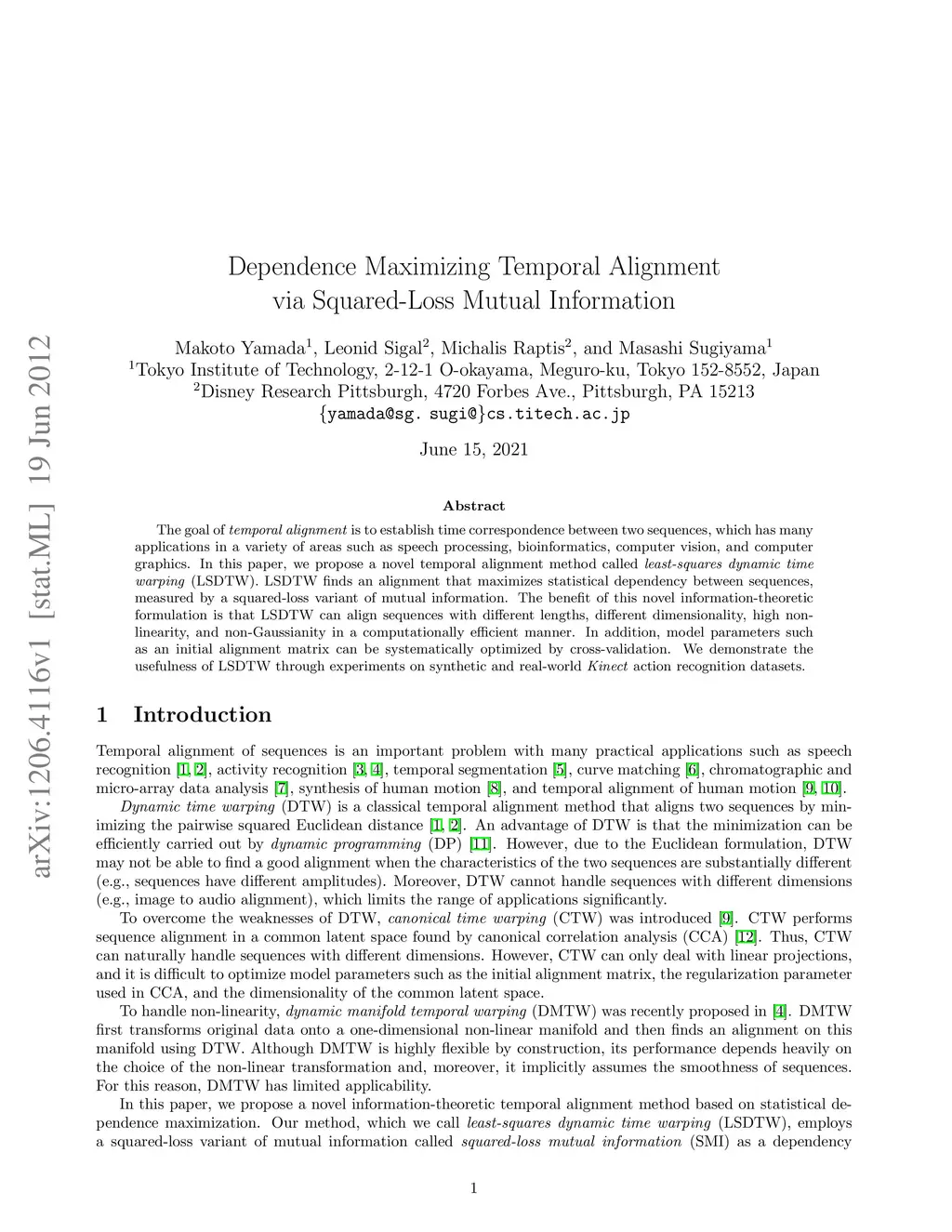 The goal of temporal alignment is to establish time correspondence between two sequences, which has many applications in a variety of areas such as speech processing, bioinformatics, computer vision, and computer graphics. In this paper, we propose a novel temporal alignment method called least-squares dynamic time warping (LSDTW). LSDTW finds an alignment that maximizes statistical dependency between sequences, measured by a squared-loss variant of mutual information. The benefit of this novel information-theoretic formulation is that LSDTW can align sequences with different lengths, different dimensionality, high non-linearity, and non-Gaussianity in a computationally efficient manner. In addition, model parameters such as an initial alignment matrix can be systematically optimized by cross-validation. We demonstrate the usefulness of LSDTW through experiments on synthetic and real-world Kinect action recognition datasets.
