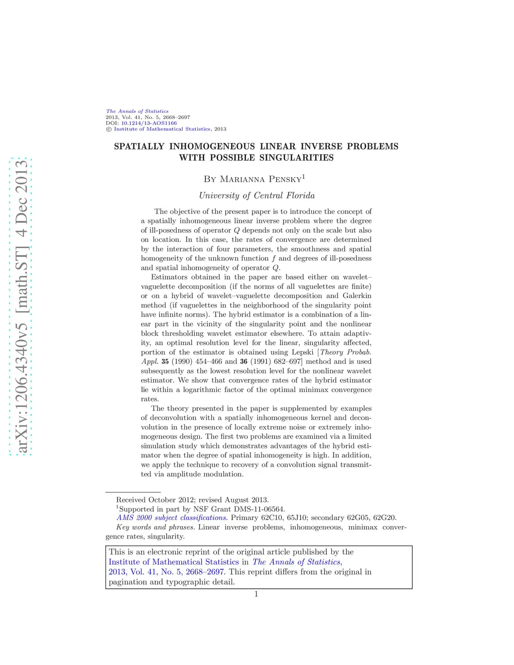 The objective of the present paper is to introduce the concept of a spatially inhomogeneous linear inverse problem where the degree of ill-posedness of operator depends not only on the scale but also on location. In this case, the rates of convergence are determined by the interaction of four parameters, the smoothness and spatial homogeneity of the unknown function and degrees of ill-posedness and spatial inhomogeneity of operator . Estimators obtained in the paper are based either on wavelet-vaguelette decomposition (if the norms of all vaguelettes are finite) or on a hybrid of wavelet-vaguelette decomposition and Galerkin method (if vaguelettes in the neighborhood of the singularity point have infinite norms). The hybrid estimator is a combination of a linear part in the vicinity of the singularity point and the nonlinear block thresholding wavelet estimator elsewhere. To attain adaptivity, an optimal resolution level for the linear, singularity affected, portion of the estimator is obtained using Lepski [Theory Probab. Appl. 35 (1990) 454-466 and 36 (1991) 682-697] method and is used subsequently as the lowest resolution level for the nonlinear wavelet estimator. We show that convergence rates of the hybrid estimator lie within a logarithmic factor of the optimal minimax convergence rates. The theory presented in the paper is supplemented by examples of deconvolution with a spatially inhomogeneous kernel and deconvolution in the presence of locally extreme noise or extremely inhomogeneous design. The first two problems are examined via a limited simulation study which demonstrates advantages of the hybrid estimator when the degree of spatial inhomogeneity is high. In addition, we apply the technique to recovery of a convolution signal transmitted via amplitude modulation.