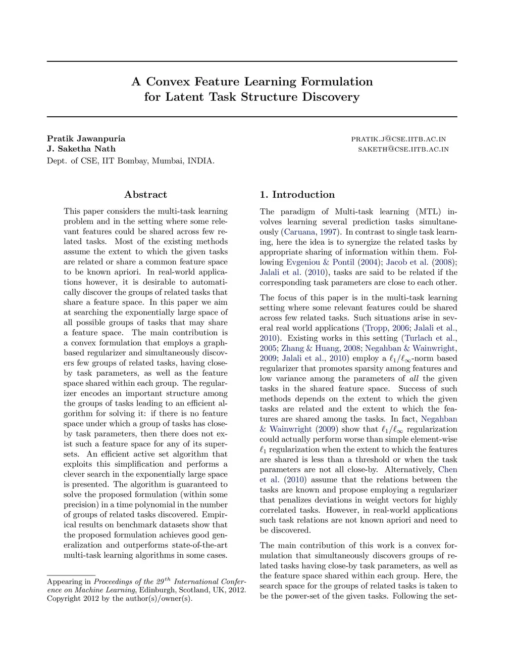 This paper considers the multi-task learning problem and in the setting where some relevant features could be shared across few related tasks. Most of the existing methods assume the extent to which the given tasks are related or share a common feature space to be known apriori. In real-world applications however, it is desirable to automatically discover the groups of related tasks that share a feature space. In this paper we aim at searching the exponentially large space of all possible groups of tasks that may share a feature space. The main contribution is a convex formulation that employs a graph-based regularizer and simultaneously discovers few groups of related tasks, having close-by task parameters, as well as the feature space shared within each group. The regularizer encodes an important structure among the groups of tasks leading to an efficient algorithm for solving it: if there is no feature space under which a group of tasks has close-by task parameters, then there does not exist such a feature space for any of its supersets. An efficient active set algorithm that exploits this simplification and performs a clever search in the exponentially large space is presented. The algorithm is guaranteed to solve the proposed formulation (within some precision) in a time polynomial in the number of groups of related tasks discovered. Empirical results on benchmark datasets show that the proposed formulation achieves good generalization and outperforms state-of-the-art multi-task learning algorithms in some cases.