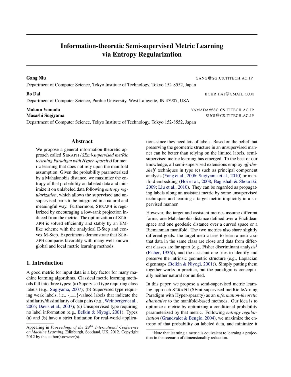 We propose a general information-theoretic approach called Seraph (SEmi-supervised metRic leArning Paradigm with Hyper-sparsity) for metric learning that does not rely upon the manifold assumption. Given the probability parameterized by a Mahalanobis distance, we maximize the entropy of that probability on labeled data and minimize it on unlabeled data following entropy regularization, which allows the supervised and unsupervised parts to be integrated in a natural and meaningful way. Furthermore, Seraph is regularized by encouraging a low-rank projection induced from the metric. The optimization of Seraph is solved efficiently and stably by an EM-like scheme with the analytical E-Step and convex M-Step. Experiments demonstrate that Seraph compares favorably with many well-known global and local metric learning methods.
