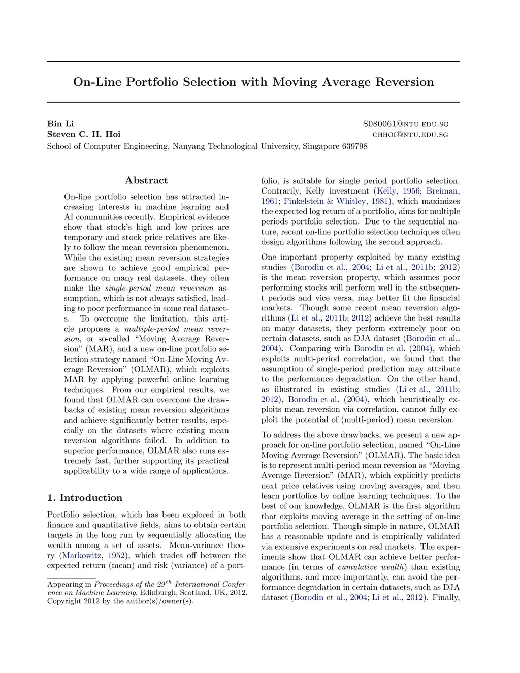 On-Line Portfolio Selection with Moving Average Reversion