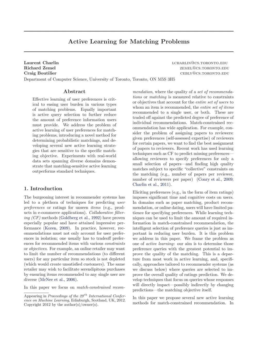 Effective learning of user preferences is critical to easing user burden in various types of matching problems. Equally important is active query selection to further reduce the amount of preference information users must provide. We address the problem of active learning of user preferences for matching problems, introducing a novel method for determining probabilistic matchings, and developing several new active learning strategies that are sensitive to the specific matching objective. Experiments with real-world data sets spanning diverse domains demonstrate that matching-sensitive active learning