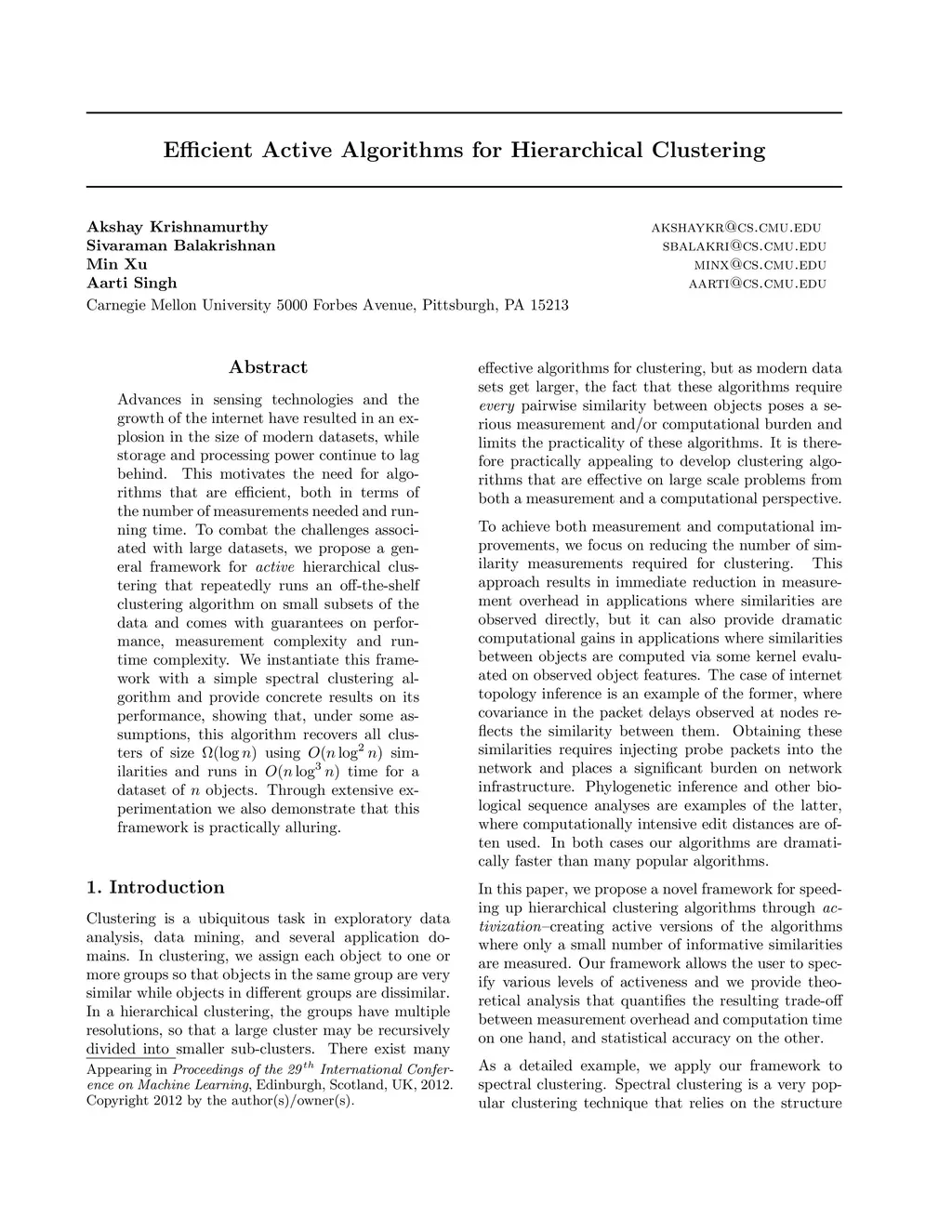 Advances in sensing technologies and the growth of the internet have resulted in an explosion in the size of modern datasets, while storage and processing power continue to lag behind. This motivates the need for algorithms that are efficient, both in terms of the number of measurements needed and running time. To combat the challenges associated with large datasets, we propose a general framework for active hierarchical clustering that repeatedly runs an off-the-shelf clustering algorithm on small subsets of the data and comes with guarantees on performance, measurement complexity and runtime complexity. We instantiate this framework with a simple spectral clustering algorithm and provide concrete results on its performance, showing that, under some assumptions, this algorithm recovers all clusters of size ?(log n) using O(n log^2 n) similarities and runs in O(n log^3 n) time for a dataset of n objects. Through extensive experimentation we also demonstrate that this framework is practically alluring.