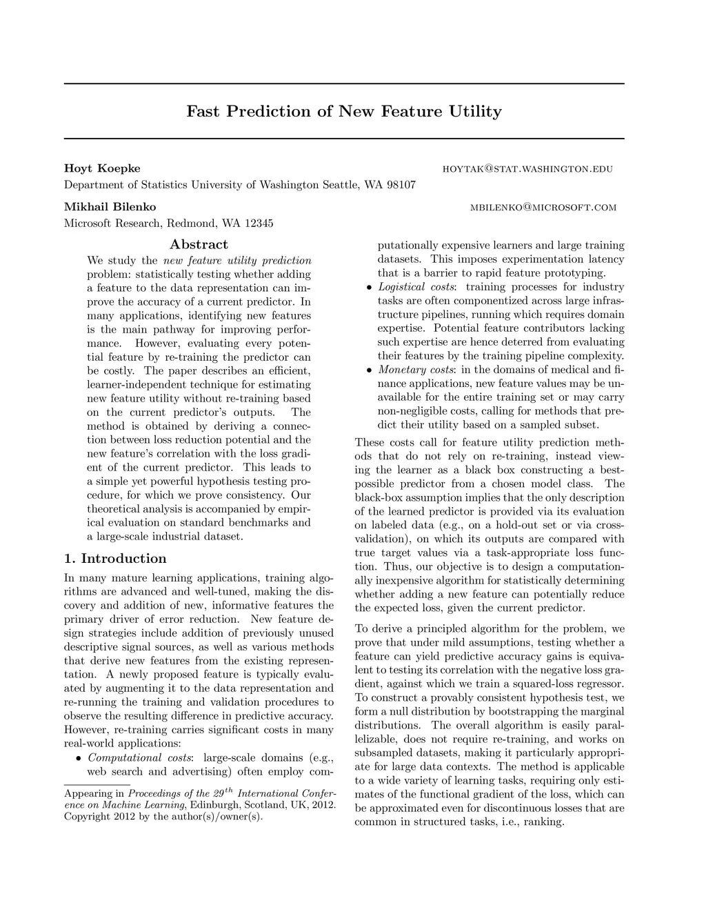 We study the new feature utility prediction problem: statistically testing whether adding a new feature to the data representation can improve predictive accuracy on a supervised learning task. In many applications, identifying new informative features is the primary pathway for improving performance. However, evaluating every potential feature by re-training the predictor with it can be costly. The paper describes an efficient, learner-independent technique for estimating new feature utility without re-training based on the current predictor's outputs. The method is obtained by deriving a connection between loss reduction potential and the new feature's correlation with the loss gradient of the current predictor. This leads to a simple yet powerful hypothesis testing procedure, for which we prove consistency. Our theoretical analysis is accompanied by empirical evaluation on standard benchmarks and a large-scale industrial dataset.