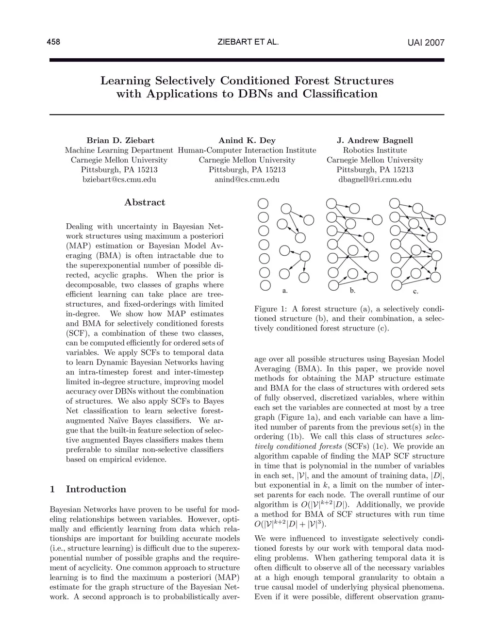Dealing with uncertainty in Bayesian Network structures using maximum a posteriori (MAP) estimation or Bayesian Model Averaging (BMA) is often intractable due to the superexponential number of possible directed, acyclic graphs. When the prior is decomposable, two classes of graphs where efficient learning can take place are tree structures, and fixed-orderings with limited in-degree. We show how MAP estimates and BMA for selectively conditioned forests (SCF), a combination of these two classes, can be computed efficiently for ordered sets of variables. We apply SCFs to temporal data to learn Dynamic Bayesian Networks having an intra-timestep forest and inter-timestep limited in-degree structure, improving model accuracy over DBNs without the combination of structures. We also apply SCFs to Bayes Net classification to learn selective forest augmented Naive Bayes classifiers. We argue that the built-in feature selection of selective augmented Bayes classifiers makes them preferable to similar non-selective classifiers based on empirical evidence.