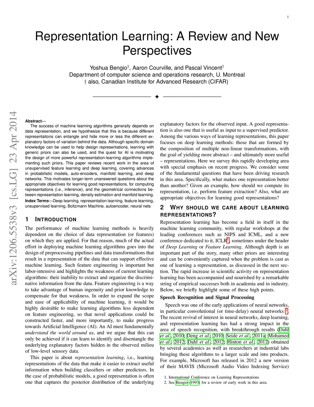 The success of machine learning algorithms generally depends on data representation, and we hypothesize that this is because different representations can entangle and hide more or less the different explanatory factors of variation behind the data. Although specific domain knowledge can be used to help design representations, learning with generic priors can also be used, and the quest for AI is motivating the design of more powerful representation-learning algorithms implementing such priors. This paper reviews recent work in the area of unsupervised feature learning and deep learning, covering advances in probabilistic models, auto-encoders, manifold learning, and deep networks. This motivates longer-term unanswered questions about the appropriate objectives for learning good representations, for computing representations (i.e., inference), and the geometrical connections between representation learning, density estimation and manifold learning.