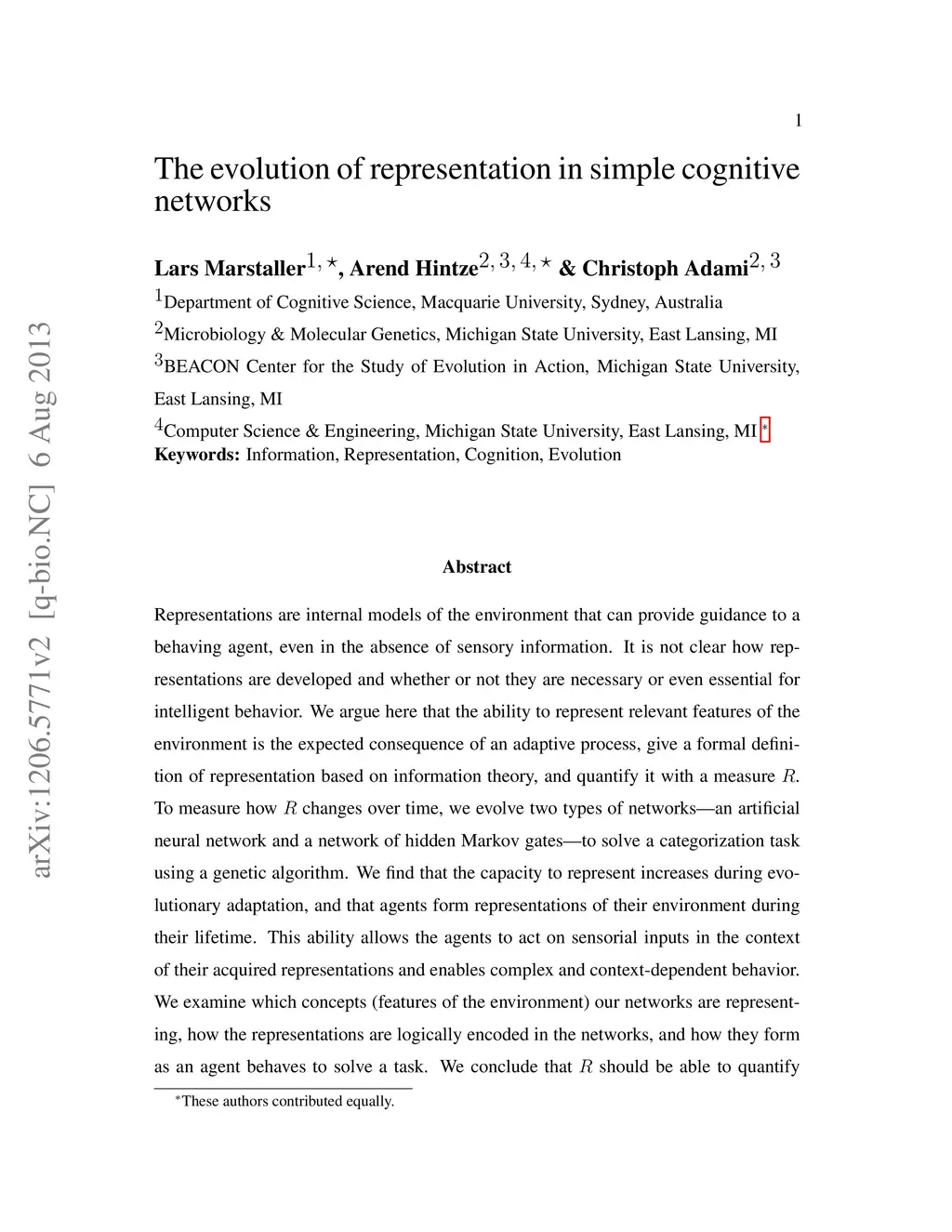 Representations are internal models of the environment that can provide guidance to a behaving agent, even in the absence of sensory information. It is not clear how representations are developed and whether or not they are necessary or even essential for intelligent behavior. We argue here that the ability to represent relevant features of the environment is the expected consequence of an adaptive process, give a formal definition of representation based on information theory, and quantify it with a measure R. To measure how R changes over time, we evolve two types of networks---an artificial neural network and a network of hidden Markov gates---to solve a categorization task using a genetic algorithm. We find that the capacity to represent increases during evolutionary adaptation, and that agents form representations of their environment during their lifetime. This ability allows the agents to act on sensorial inputs in the context of their acquired representations and enables complex and context-dependent behavior. We examine which concepts (features of the environment) our networks are representing, how the representations are logically encoded in the networks, and how they form as an agent behaves to solve a task. We conclude that R should be able to quantify the representations within any cognitive system, and should be predictive of an agent's long-term adaptive success.