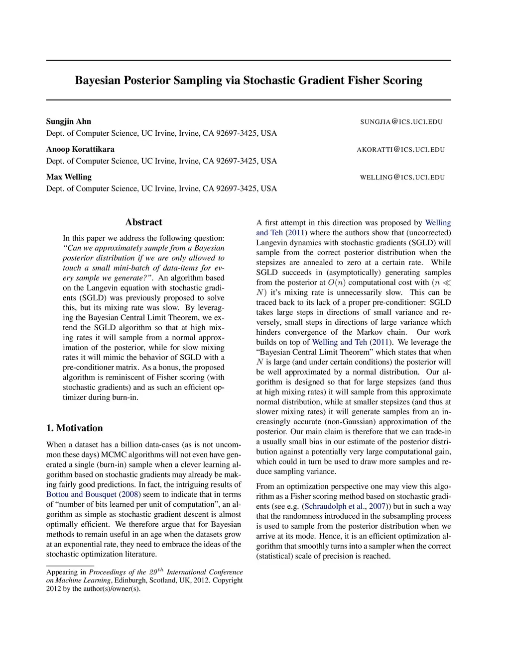 In this paper we address the following question: Can we approximately sample from a Bayesian posterior distribution if we are only allowed to touch a small mini-batch of data-items for every sample we generate?. An algorithm based on the Langevin equation with stochastic gradients (SGLD) was previously proposed to solve this, but its mixing rate was slow. By leveraging the Bayesian Central Limit Theorem, we extend the SGLD algorithm so that at high mixing rates it will sample from a normal approximation of the posterior, while for slow mixing rates it will mimic the behavior of SGLD with a pre-conditioner matrix. As a bonus, the proposed algorithm is reminiscent of Fisher scoring (with stochastic gradients) and as such an efficient optimizer during burn-in.