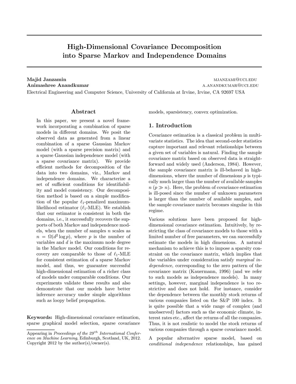 In this paper, we present a novel framework incorporating a combination of sparse models in different domains. We posit the observed data as generated from a linear combination of a sparse Gaussian Markov model (with a sparse precision matrix) and a sparse Gaussian independence model (with a sparse covariance matrix). We provide efficient methods for decomposition of the data into two domains, \viz Markov and independence domains. We characterize a set of sufficient conditions for identifiability and model consistency. Our decomposition method is based on a simple modification of the popular -penalized maximum-likelihood estimator (-MLE). We establish that our estimator is consistent in both the domains, i.e., it successfully recovers the supports of both Markov and independence models, when the number of samples scales as , where is the number of variables and is the maximum node degree in the Markov model. Our conditions for recovery are comparable to those of -MLE for consistent estimation of a sparse Markov model, and thus, we guarantee successful high-dimensional estimation of a richer class of models under comparable conditions. Our experiments validate these results and also demonstrate that our models have better inference accuracy under simple algorithms such as loopy belief propagation.