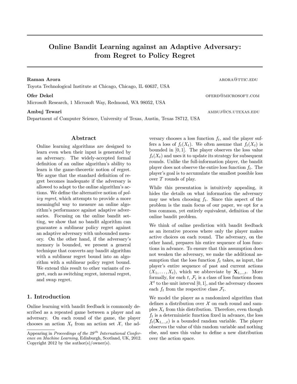 Online learning algorithms are designed to learn even when their input is generated by an adversary. The widely-accepted formal definition of an online algorithm's ability to learn is the game-theoretic notion of regret. We argue that the standard definition of regret becomes inadequate if the adversary is allowed to adapt to the online algorithm's actions. We define the alternative notion of policy regret, which attempts to provide a more meaningful way to measure an online algorithm's performance against adaptive adversaries. Focusing on the online bandit setting, we show that no bandit algorithm can guarantee a sublinear policy regret against an adaptive adversary with unbounded memory. On the other hand, if the adversary's memory is bounded, we present a general technique that converts any bandit algorithm with a sublinear regret bound into an algorithm with a sublinear policy regret bound. We extend this result to other variants of regret, such as switching regret, internal regret, and swap regret.