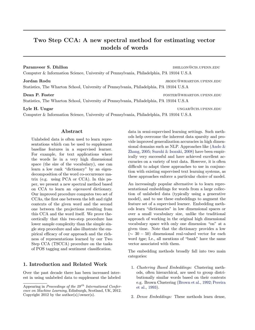Unlabeled data is often used to learn representations which can be used to supplement baseline features in a supervised learner. For example, for text applications where the words lie in a very high dimensional space (the size of the vocabulary), one can learn a low rank "dictionary" by an eigen-decomposition of the word co-occurrence matrix (e.g. using PCA or CCA). In this paper, we present a new spectral method based on CCA to learn an eigenword dictionary. Our improved procedure computes two set of CCAs, the first one between the left and right contexts of the given word and the second one between the projections resulting from this CCA and the word itself. We prove theoretically that this two-step procedure has lower sample complexity than the simple single step procedure and also illustrate the empirical efficacy of our approach and the richness of representations learned by our Two Step CCA (TSCCA) procedure on the tasks of POS tagging and sentiment classification.