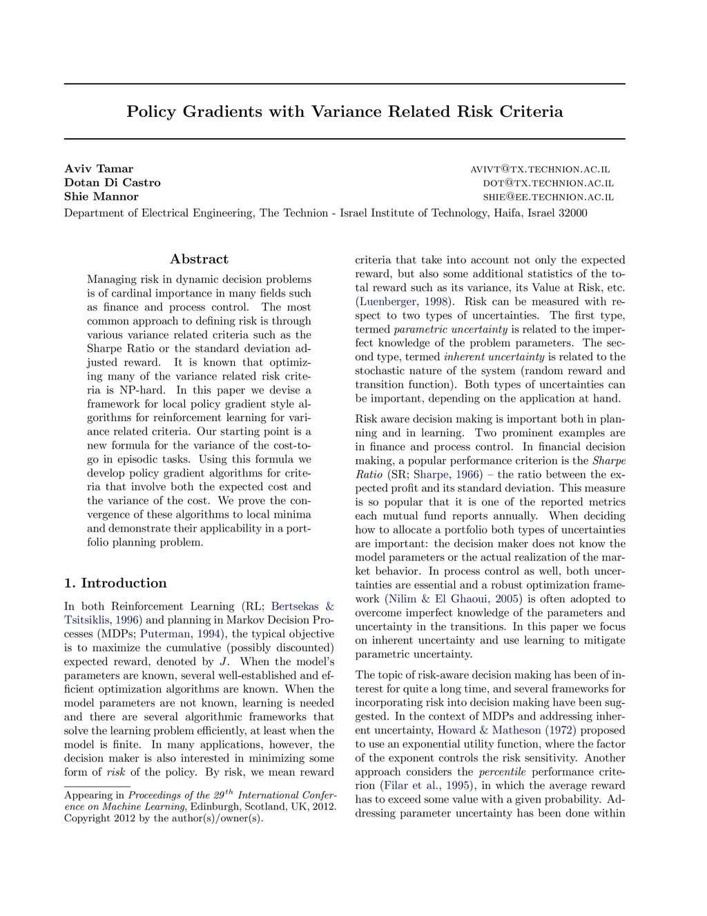 Managing risk in dynamic decision problems is of cardinal importance in many fields such as finance and process control. The most common approach to defining risk is through various variance related criteria such as the Sharpe Ratio or the standard deviation adjusted reward. It is known that optimizing many of the variance related risk criteria is NP-hard. In this paper we devise a framework for local policy gradient style algorithms for reinforcement learning for variance related criteria. Our starting point is a new formula for the variance of the cost-to-go in episodic tasks. Using this formula we develop policy gradient algorithms for criteria that involve both the expected cost and the variance of the cost. We prove the convergence of these algorithms to local minima and demonstrate their applicability in a portfolio planning problem.