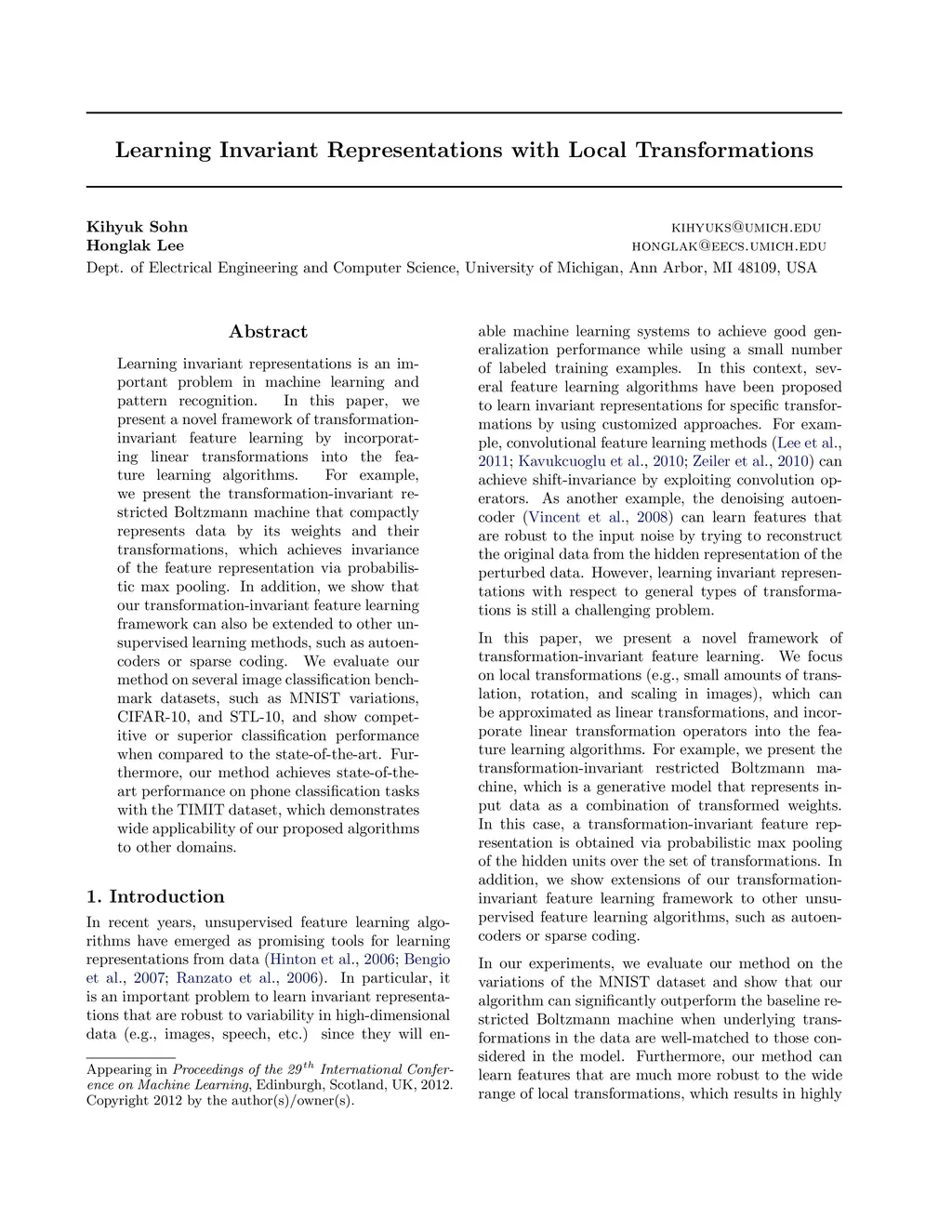 Learning invariant representations is an important problem in machine learning and pattern recognition. In this paper, we present a novel framework of transformation-invariant feature learning by incorporating linear transformations into the feature learning algorithms. For example, we present the transformation-invariant restricted Boltzmann machine that compactly represents data by its weights and their transformations, which achieves invariance of the feature representation via probabilistic max pooling. In addition, we show that our transformation-invariant feature learning framework can also be extended to other unsupervised learning methods, such as autoencoders or sparse coding. We evaluate our method on several image classification benchmark datasets, such as MNIST variations, CIFAR-10, and STL-10, and show competitive or superior classification performance when compared to the state-of-the-art. Furthermore, our method achieves state-of-the-art performance on phone classification tasks with the TIMIT dataset, which demonstrates wide applicability of our proposed algorithms to other domains.