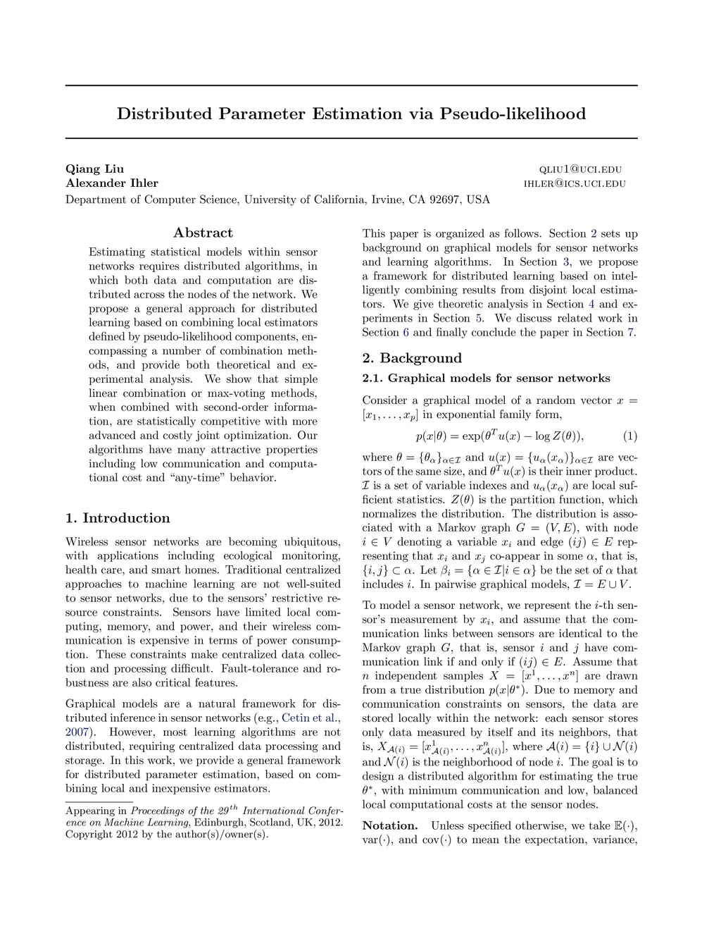 Estimating statistical models within sensor networks requires distributed algorithms, in which both data and computation are distributed across the nodes of the network. We propose a general approach for distributed learning based on combining local estimators defined by pseudo-likelihood components, encompassing a number of combination methods, and provide both theoretical and experimental analysis. We show that simple linear combination or max-voting methods, when combined with second-order information, are statistically competitive with more advanced and costly joint optimization. Our algorithms have many attractive properties including low communication and computational cost and "any-time" behavior.