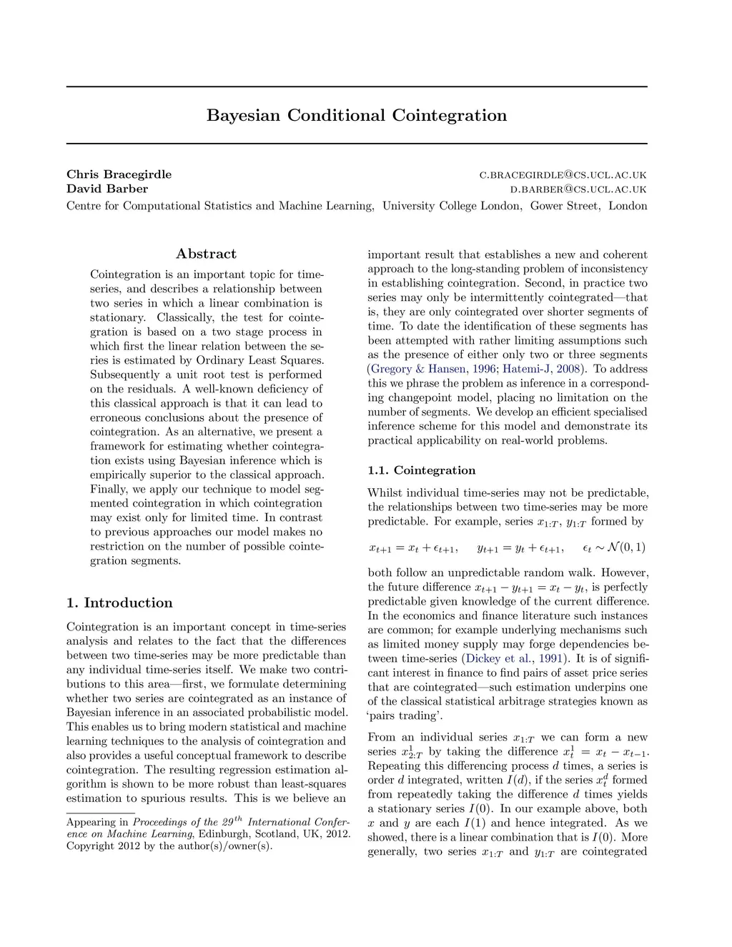 Cointegration is an important topic for time-series, and describes a relationship between two series in which a linear combination is stationary. Classically, the test for cointegration is based on a two stage process in which first the linear relation between the series is estimated by Ordinary Least Squares. Subsequently a unit root test is performed on the residuals. A well-known deficiency of this classical approach is that it can lead to erroneous conclusions about the presence of cointegration. As an alternative, we present a framework for estimating whether cointegration exists using Bayesian inference which is empirically superior to the classical approach. Finally, we apply our technique to model segmented cointegration in which cointegration may exist only for limited time. In contrast to previous approaches our model makes no restriction on the number of possible cointegration segments.