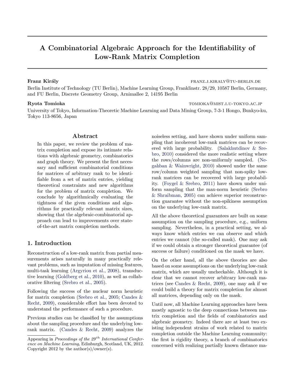 In this paper, we review the problem of matrix completion and expose its intimate relations with algebraic geometry, combinatorics and graph theory. We present the first necessary and sufficient combinatorial conditions for matrices of arbitrary rank to be identifiable from a set of matrix entries, yielding theoretical constraints and new algorithms for the problem of matrix completion. We conclude by algorithmically evaluating the tightness of the given conditions and algorithms for practically relevant matrix sizes, showing that the algebraic-combinatoric approach can lead to improvements over state-of-the-art matrix completion methods.