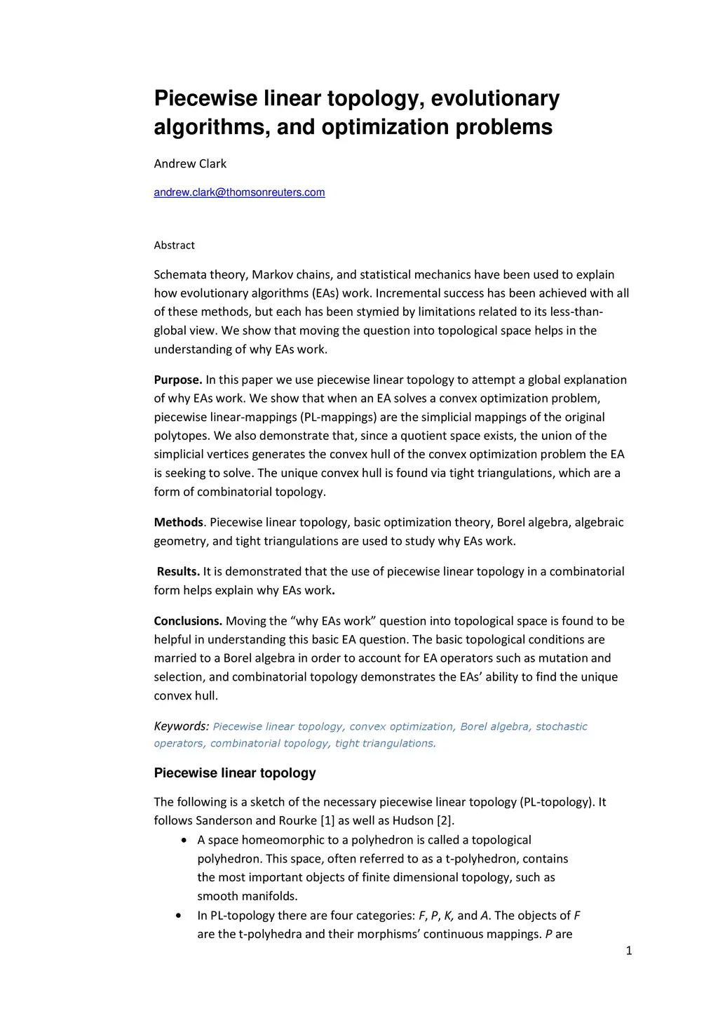Piecewise Linear Topology, Evolutionary Algorithms, and Optimization