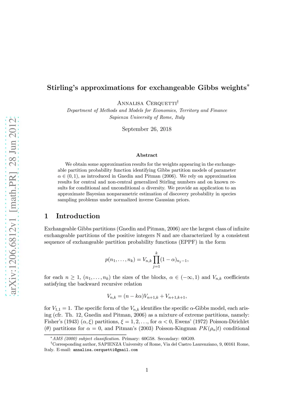 We obtain some approximation results for the weights appearing in the exchangeable partition probability function identifying Gibbs partition models of parameter , as introduced in Gnedin and Pitman (2006). We rely on approximation results for central and non-central generalized Stirling numbers and on known results for conditional and unconditional diversity. We provide an application to an approximate Bayesian nonparametric estimation of discovery probability in species sampling problems under normalized inverse Gaussian priors.