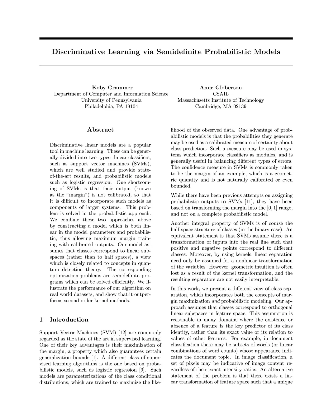Discriminative Learning via Semidefinite Probabilistic Models