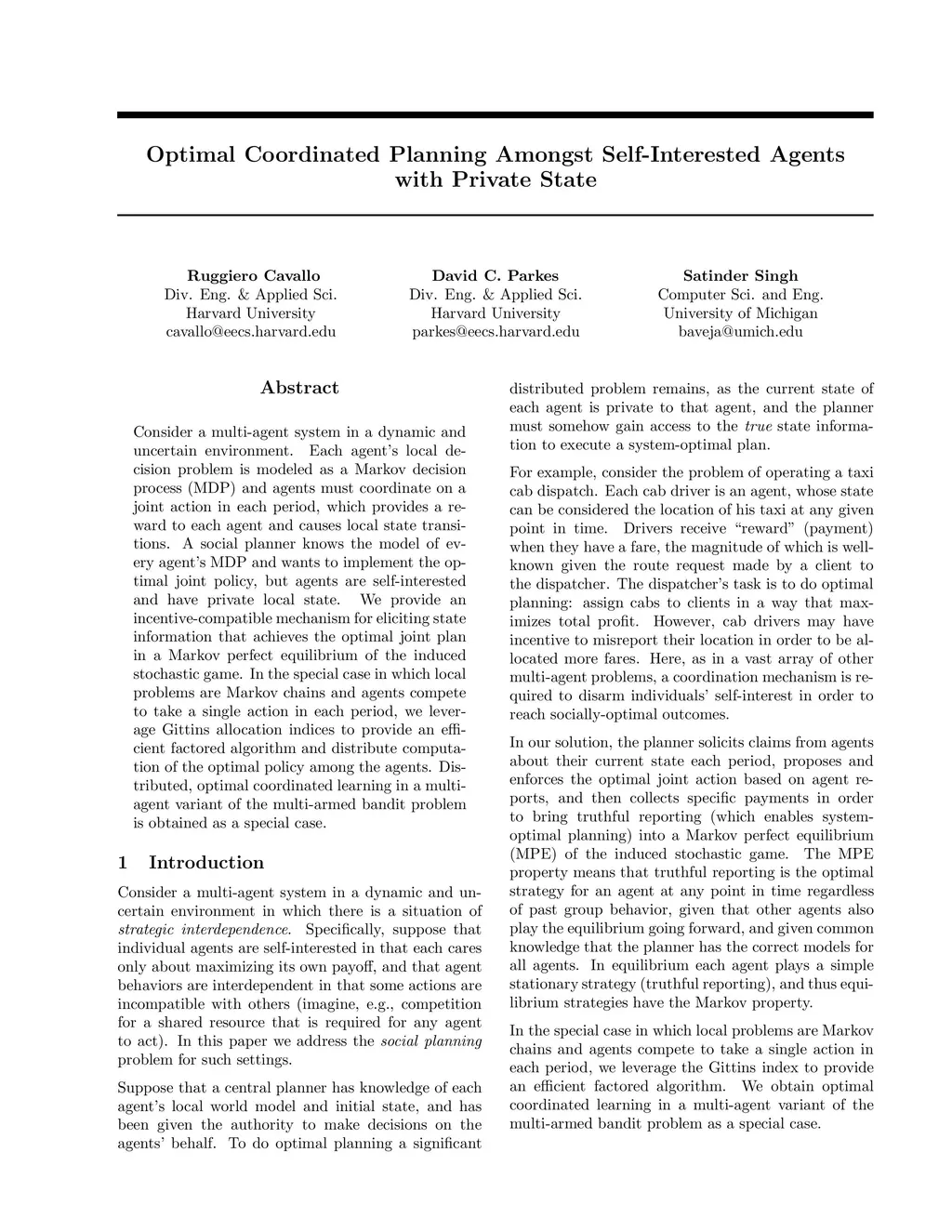 Consider a multi-agent system in a dynamic and uncertain environment. Each agent's local decision problem is modeled as a Markov decision process (MDP) and agents must coordinate on a joint action in each period, which provides a reward to each agent and causes local state transitions. A social planner knows the model of every agent's MDP and wants to implement the optimal joint policy, but agents are self-interested and have private local state. We provide an incentive-compatible mechanism for eliciting state information that achieves the optimal joint plan in a Markov perfect equilibrium of the induced stochastic game. In the special case in which local problems are Markov chains and agents compete to take a single action in each period, we leverage Gittins allocation indices to provide an efficient factored algorithm and distribute computation of the optimal policy among the agents. Distributed, optimal coordinated learning in a multi-agent variant of the multi-armed bandit problem is obtained as a special case.