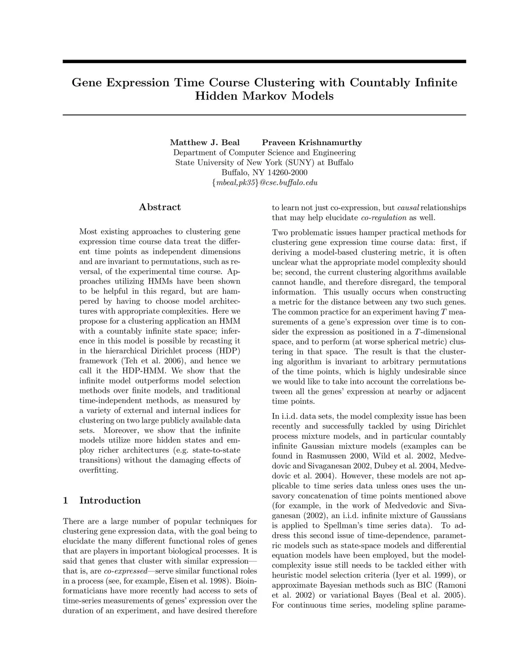 Most existing approaches to clustering gene expression time course data treat the different time points as independent dimensions and are invariant to permutations, such as reversal, of the experimental time course. Approaches utilizing HMMs have been shown to be helpful in this regard, but are hampered by having to choose model architectures with appropriate complexities. Here we propose for a clustering application an HMM with a countably infinite state space; inference in this model is possible by recasting it in the hierarchical Dirichlet process (HDP) framework (Teh et al. 2006), and hence we call it the HDP-HMM. We show that the infinite model outperforms model selection methods over finite models, and traditional time-independent methods, as measured by a variety of external and internal indices for clustering on two large publicly available data sets. Moreover, we show that the infinite models utilize more hidden states and employ richer architectures (e.g. state-to-state transitions) without the damaging effects of overfitting.