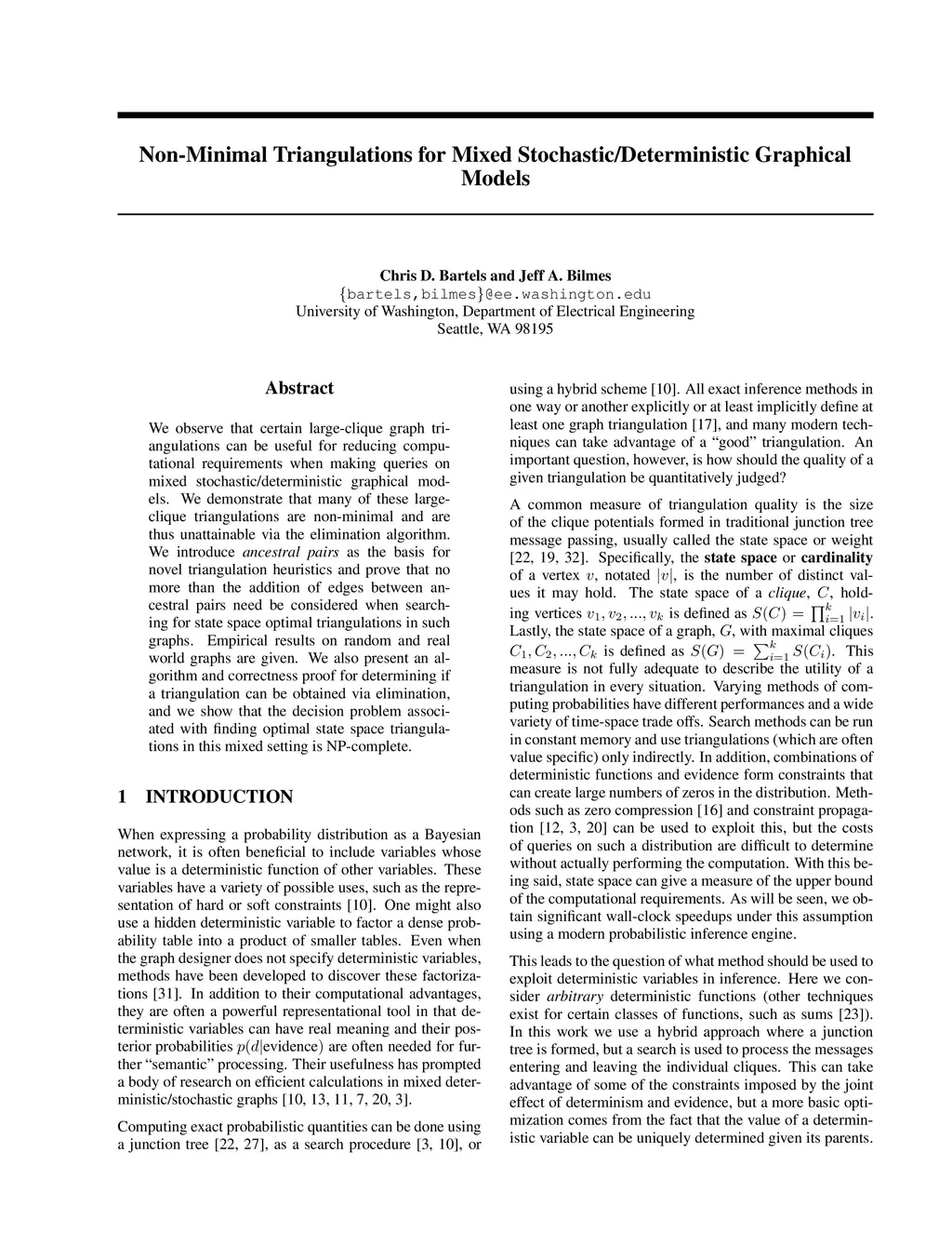 We observe that certain large-clique graph triangulations can be useful to reduce both computational and space requirements when making queries on mixed stochastic/deterministic graphical models. We demonstrate that many of these large-clique triangulations are non-minimal and are thus unattainable via the variable elimination algorithm. We introduce ancestral pairs as the basis for novel triangulation heuristics and prove that no more than the addition of edges between ancestral pairs need be considered when searching for state space optimal triangulations in such graphs. Empirical results on random and real world graphs show that the resulting triangulations that yield significant speedups are almost always non-minimal. We also give an algorithm and correctness proof for determining if a triangulation can be obtained via elimination, and we show that the decision problem associated with finding optimal state space triangulations in this mixed stochastic/deterministic setting is NP-complete.