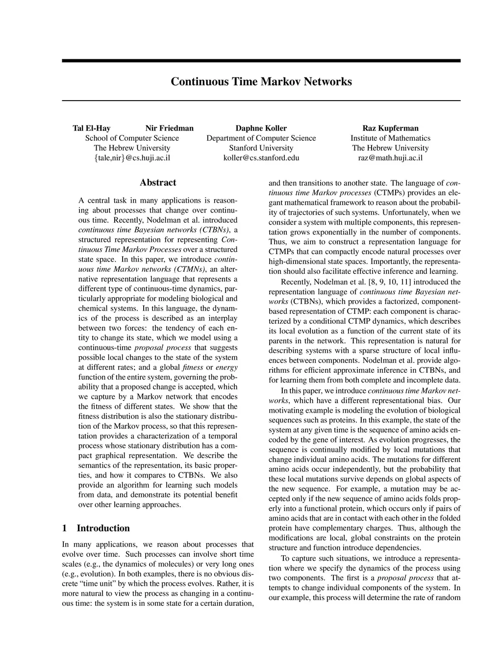 A central task in many applications is reasoning about processes that change in a continuous time. The mathematical framework of Continuous Time Markov Processes provides the basic foundations for modeling such systems. Recently, Nodelman et al introduced continuous time Bayesian networks (CTBNs), which allow a compact representation of continuous-time processes over a factored state space. In this paper, we introduce continuous time Markov networks (CTMNs), an alternative representation language that represents a different type of continuous-time dynamics. In many real life processes, such as biological and chemical systems, the dynamics of the process can be naturally described as an interplay between two forces - the tendency of each entity to change its state, and the overall fitness or energy function of the entire system. In our model, the first force is described by a continuous-time proposal process that suggests possible local changes to the state of the system at different rates. The second force is represented by a Markov network that encodes the fitness, or desirability, of different states; a proposed local change is then accepted with a probability that is a function of the change in the fitness distribution. We show that the fitness distribution is also the stationary distribution of the Markov process, so that this representation provides a characterization of a temporal process whose stationary distribution has a compact graphical representation. This allows us to naturally capture a different type of structure in complex dynamical processes, such as evolving biological sequences. We describe the semantics of the representation, its basic properties, and how it compares to CTBNs. We also provide algorithms for learning such models from data, and discuss its applicability to biological sequence evolution.