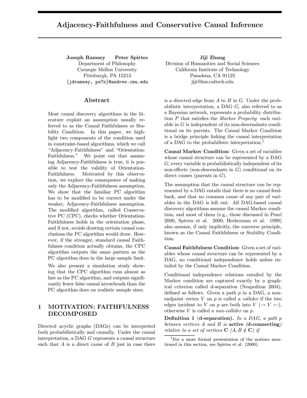 Most causal inference algorithms in the literature (e.g., Pearl (2000), Spirtes et al. (2000), Heckerman et al. (1999)) exploit an assumption usually referred to as the causal Faithfulness or Stability condition. In this paper, we highlight two components of the condition used in constraint-based algorithms, which we call "Adjacency-Faithfulness" and "Orientation-Faithfulness". We point out that assuming Adjacency-Faithfulness is true, it is in principle possible to test the validity of Orientation-Faithfulness. Based on this observation, we explore the consequence of making only the Adjacency-Faithfulness assumption. We show that the familiar PC algorithm has to be modified to be (asymptotically) correct under the weaker, Adjacency-Faithfulness assumption. Roughly the modified algorithm, called Conservative PC (CPC), checks whether Orientation-Faithfulness holds in the orientation phase, and if not, avoids drawing certain causal conclusions the PC algorithm would draw. However, if the stronger, standard causal Faithfulness condition actually obtains, the CPC algorithm is shown to output the same pattern as the PC algorithm does in the large sample limit. We also present a simulation study showing that the CPC algorithm runs almost as fast as the PC algorithm, and outputs significantly fewer false causal arrowheads than the PC algorithm does on realistic sample sizes. We end our paper by discussing how score-based algorithms such as GES perform when the Adjacency-Faithfulness but not the standard causal Faithfulness condition holds, and how to extend our work to the FCI algorithm, which allows for the possibility of latent variables.
