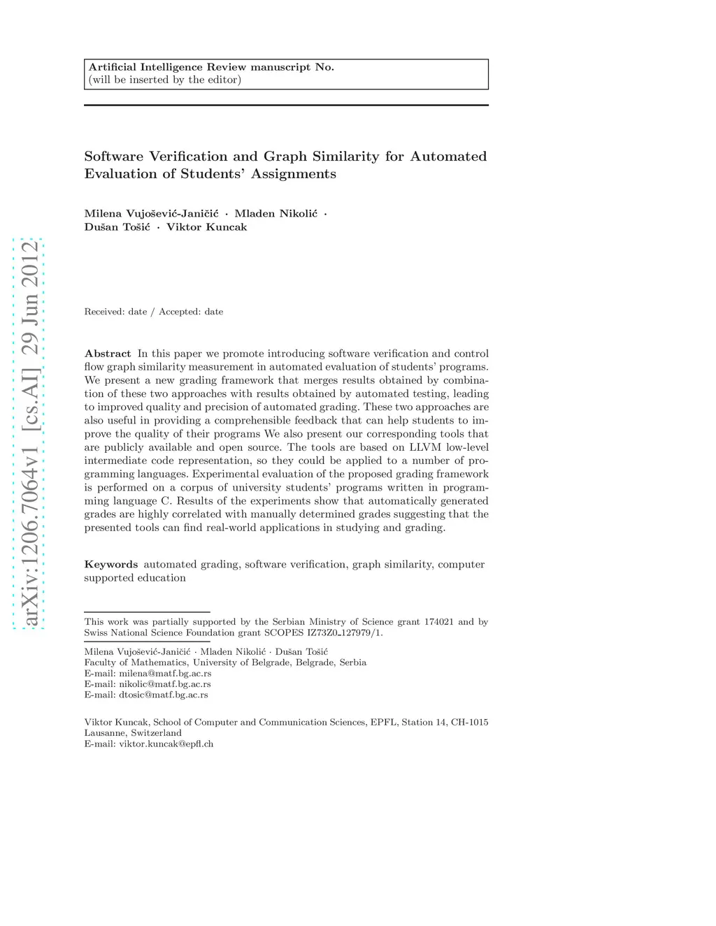 In this paper we promote introducing software verification and control flow graph similarity measurement in automated evaluation of students' programs. We present a new grading framework that merges results obtained by combination of these two approaches with results obtained by automated testing, leading to improved quality and precision of automated grading. These two approaches are also useful in providing a comprehensible feedback that can help students to improve the quality of their programs We also present our corresponding tools that are publicly available and open source. The tools are based on LLVM low-level intermediate code representation, so they could be applied to a number of programming languages. Experimental evaluation of the proposed grading framework is performed on a corpus of university students' programs written in programming language C. Results of the experiments show that automatically generated grades are highly correlated with manually determined grades suggesting that the presented tools can find real-world applications in studying and grading.