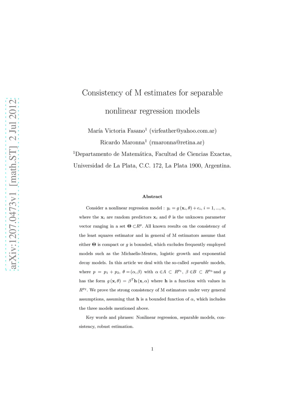 Consider a nonlinear regression model : y_{i}=g(x_{i},{\theta})+e_{i}, i=1,...,n, where the x_{i} are random predictors x_{i} and {\theta} is the unknown parameter vector ranging in a set {\Theta}\subsetR^{p}. All known results on the consistency of the least squares estimator and in general of M estimators assume that either {\Theta} is compact or g is bounded, which excludes frequently employed models such as the Michaelis-Menten, logistic growth and exponential decay models. In this article we deal with the so-called separable models, where p=p_{1}+p_{2}, {\theta}=({\alpha},{\beta}) with {\alpha}\inA\subsetR^{p_{1}}, {\beta}\inB\subsetR^{p_{2},}and g has the form g(x,{\theta})={\beta}^{T}h(x,{\alpha}) where h is a function with values in R^{p_{2}}. We prove the strong consistency of M estimators under very general assumptions, assuming that h is a bounded function of {\alpha}, which includes the three models mentioned above. Key words and phrases: Nonlinear regression, separable models, consistency, robust estimation.