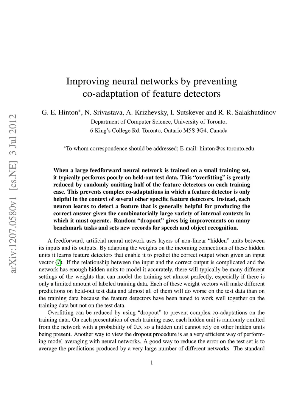 When a large feedforward neural network is trained on a small training set, it typically performs poorly on held-out test data. This "overfitting" is greatly reduced by randomly omitting half of the feature detectors on each training case. This prevents complex co-adaptations in which a feature detector is only helpful in the context of several other specific feature detectors. Instead, each neuron learns to detect a feature that is generally helpful for producing the correct answer given the combinatorially large variety of internal contexts in which it must operate. Random "dropout" gives big improvements on many benchmark tasks and sets new records for speech and object recognition.