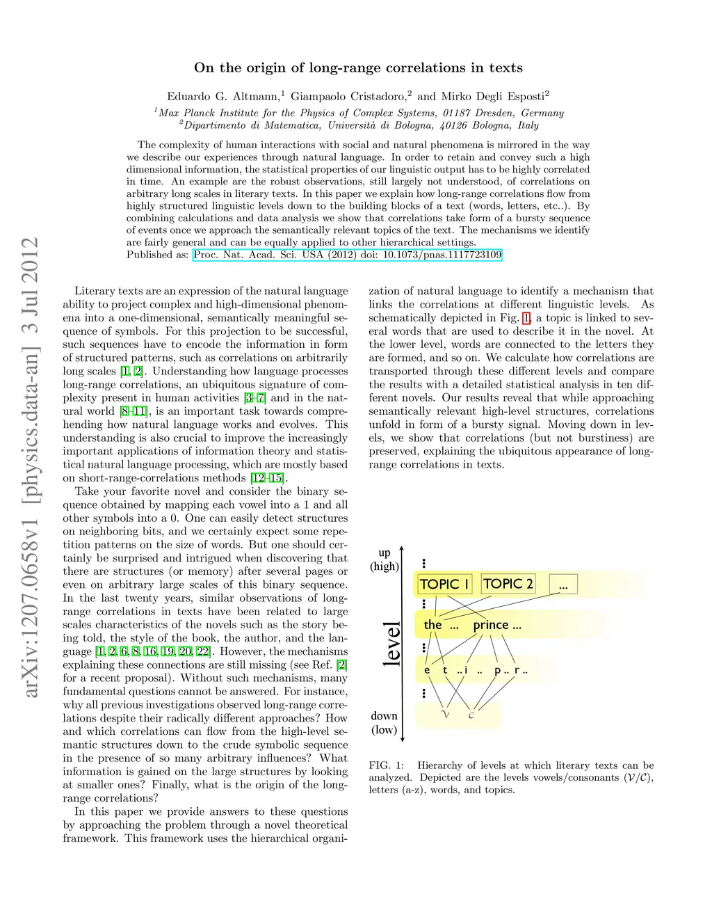 The complexity of human interactions with social and natural phenomena is mirrored in the way we describe our experiences through natural language. In order to retain and convey such a high dimensional information, the statistical properties of our linguistic output has to be highly correlated in time. An example are the robust observations, still largely not understood, of correlations on arbitrary long scales in literary texts. In this paper we explain how long-range correlations flow from highly structured linguistic levels down to the building blocks of a text (words, letters, etc..). By combining calculations and data analysis we show that correlations take form of a bursty sequence of events once we approach the semantically relevant topics of the text. The mechanisms we identify are fairly general and can be equally applied to other hierarchical settings.