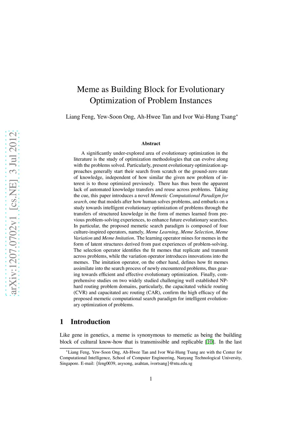 A significantly under-explored area of evolutionary optimization in the literature is the study of optimization methodologies that can evolve along with the problems solved. Particularly, present evolutionary optimization approaches generally start their search from scratch or the ground-zero state of knowledge, independent of how similar the given new problem of interest is to those optimized previously. There has thus been the apparent lack of automated knowledge transfers and reuse across problems. Taking the cue, this paper introduces a novel Memetic Computational Paradigm for search, one that models after how human solves problems, and embarks on a study towards intelligent evolutionary optimization of problems through the transfers of structured knowledge in the form of memes learned from previous problem-solving experiences, to enhance future evolutionary searches. In particular, the proposed memetic search paradigm is composed of four culture-inspired operators, namely, Meme Learning, Meme Selection, Meme Variation and Meme Imitation. The learning operator mines for memes in the form of latent structures derived from past experiences of problem-solving. The selection operator identifies the fit memes that replicate and transmit across problems, while the variation operator introduces innovations into the memes. The imitation operator, on the other hand, defines how fit memes assimilate into the search process of newly encountered problems, thus gearing towards efficient and effective evolutionary optimization. Finally, comprehensive studies on two widely studied challenging well established NP-hard routing problem domains, particularly, the capacitated vehicle routing (CVR) and capacitated arc routing (CAR), confirm the high efficacy of the proposed memetic computational search paradigm for intelligent evolutionary optimization of problems.
