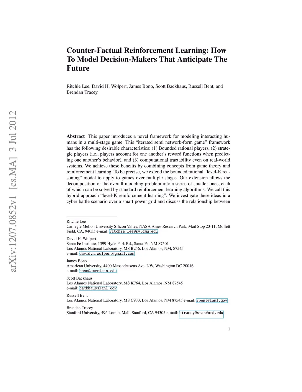 This paper introduces a novel framework for modeling interacting humans in a multi-stage game. This "iterated semi network-form game" framework has the following desirable characteristics: (1) Bounded rational players, (2) strategic players (i.e., players account for one another's reward functions when predicting one another's behavior), and (3) computational tractability even on real-world systems. We achieve these benefits by combining concepts from game theory and reinforcement learning. To be precise, we extend the bounded rational "level-K reasoning" model to apply to games over multiple stages. Our extension allows the decomposition of the overall modeling problem into a series of smaller ones, each of which can be solved by standard reinforcement learning algorithms. We call this hybrid approach "level-K reinforcement learning". We investigate these ideas in a cyber battle scenario over a smart power grid and discuss the relationship between the behavior predicted by our model and what one might expect of real human defenders and attackers.
