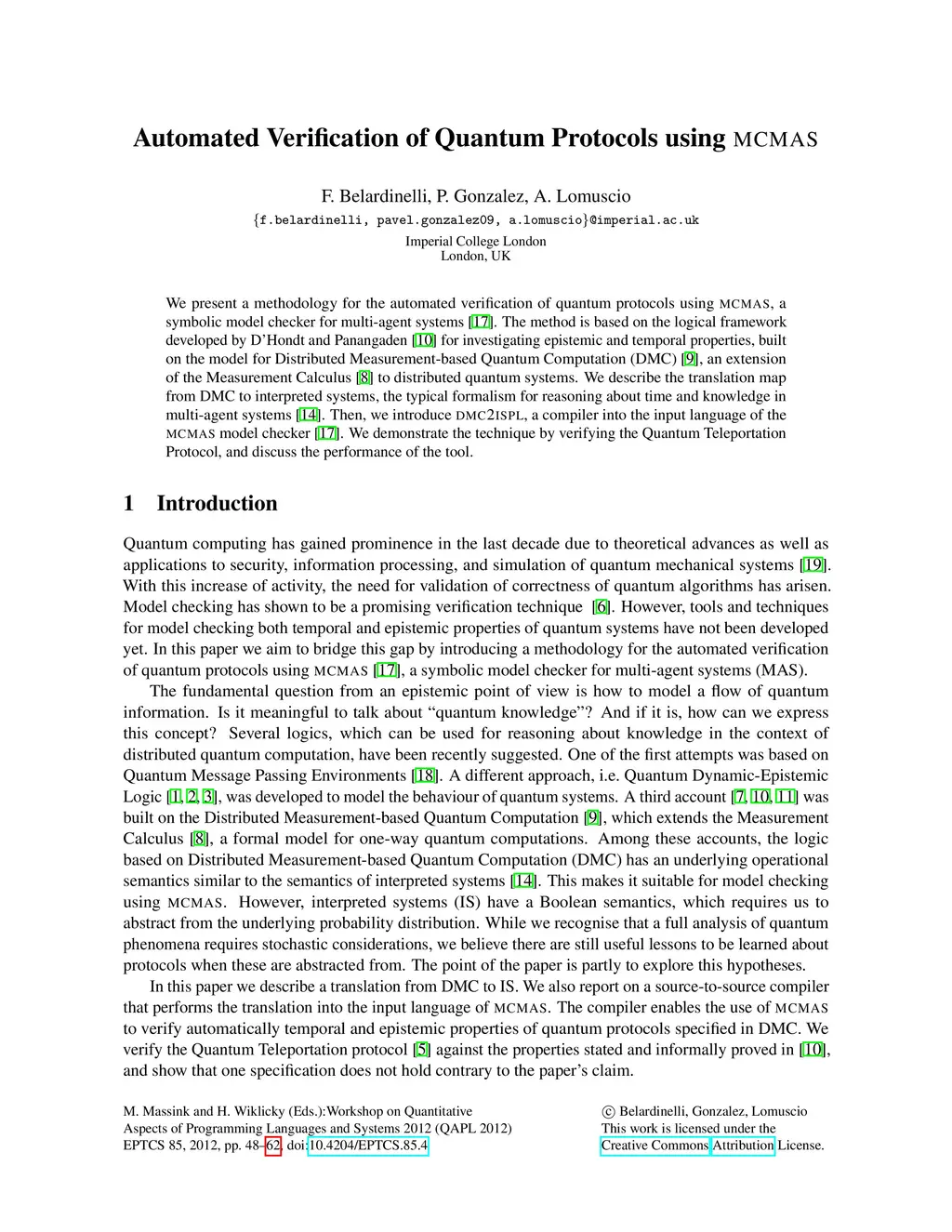 We present a methodology for the automated verification of quantum protocols using MCMAS, a symbolic model checker for multi-agent systems The method is based on the logical framework developed by D'Hondt and Panangaden for investigating epistemic and temporal properties, built on the model for Distributed Measurement-based Quantum Computation (DMC), an extension of the Measurement Calculus to distributed quantum systems. We describe the translation map from DMC to interpreted systems, the typical formalism for reasoning about time and knowledge in multi-agent systems. Then, we introduce dmc2ispl, a compiler into the input language of the MCMAS model checker. We demonstrate the technique by verifying the Quantum Teleportation Protocol, and discuss the performance of the tool.