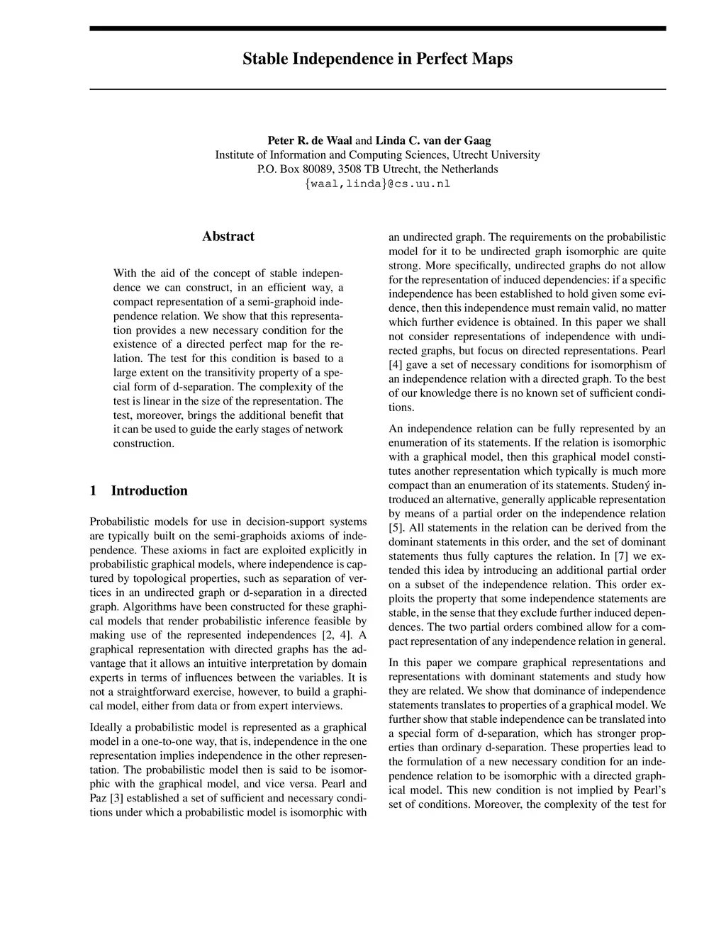 With the aid of the concept of stable independence we can construct, in an efficient way, a compact representation of a semi-graphoid independence relation. We show that this representation provides a new necessary condition for the existence of a directed perfect map for the relation. The test for this condition is based to a large extent on the transitivity property of a special form of d-separation. The complexity of the test is linear in the size of the representation. The test, moreover, brings the additional benefit that it can be used to guide the early stages of network construction.