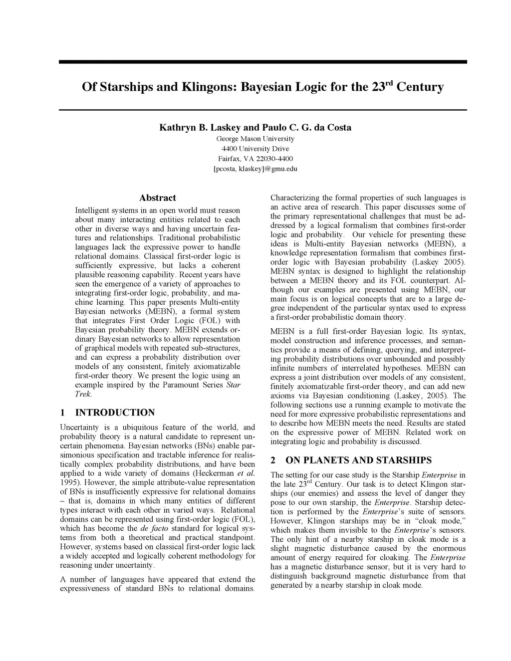 Intelligent systems in an open world must reason about many interacting entities related to each other in diverse ways and having uncertain features and relationships. Traditional probabilistic languages lack the expressive power to handle relational domains. Classical first-order logic is sufficiently expressive, but lacks a coherent plausible reasoning capability. Recent years have seen the emergence of a variety of approaches to integrating first-order logic, probability, and machine learning. This paper presents Multi-entity Bayesian networks (MEBN), a formal system that integrates First Order Logic (FOL) with Bayesian probability theory. MEBN extends ordinary Bayesian networks to allow representation of graphical models with repeated sub-structures, and can express a probability distribution over models of any consistent, finitely axiomatizable first-order theory. We present the logic using an example inspired by the Paramount Series StarTrek.