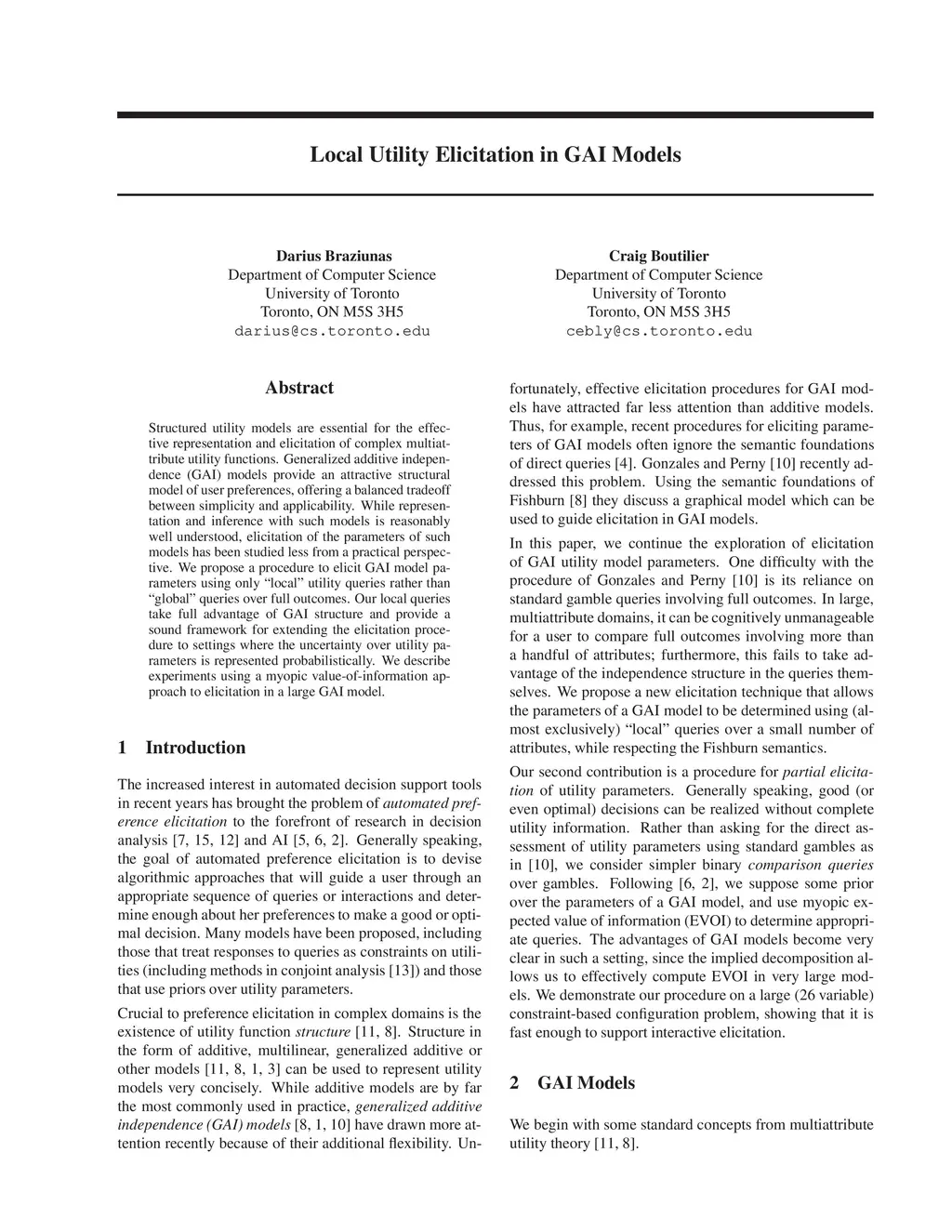 Structured utility models are essential for the effective representation and elicitation of complex multiattribute utility functions. Generalized additive independence (GAI) models provide an attractive structural model of user preferences, offering a balanced tradeoff between simplicity and applicability. While representation and inference with such models is reasonably well understood, elicitation of the parameters of such models has been studied less from a practical perspective. We propose a procedure to elicit GAI model parameters using only "local" utility queries rather than "global" queries over full outcomes. Our local queries take full advantage of GAI structure and provide a sound framework for extending the elicitation procedure to settings where the uncertainty over utility parameters is represented probabilistically. We describe experiments using a myopic value-of-information approach to elicitation in a large GAI model.