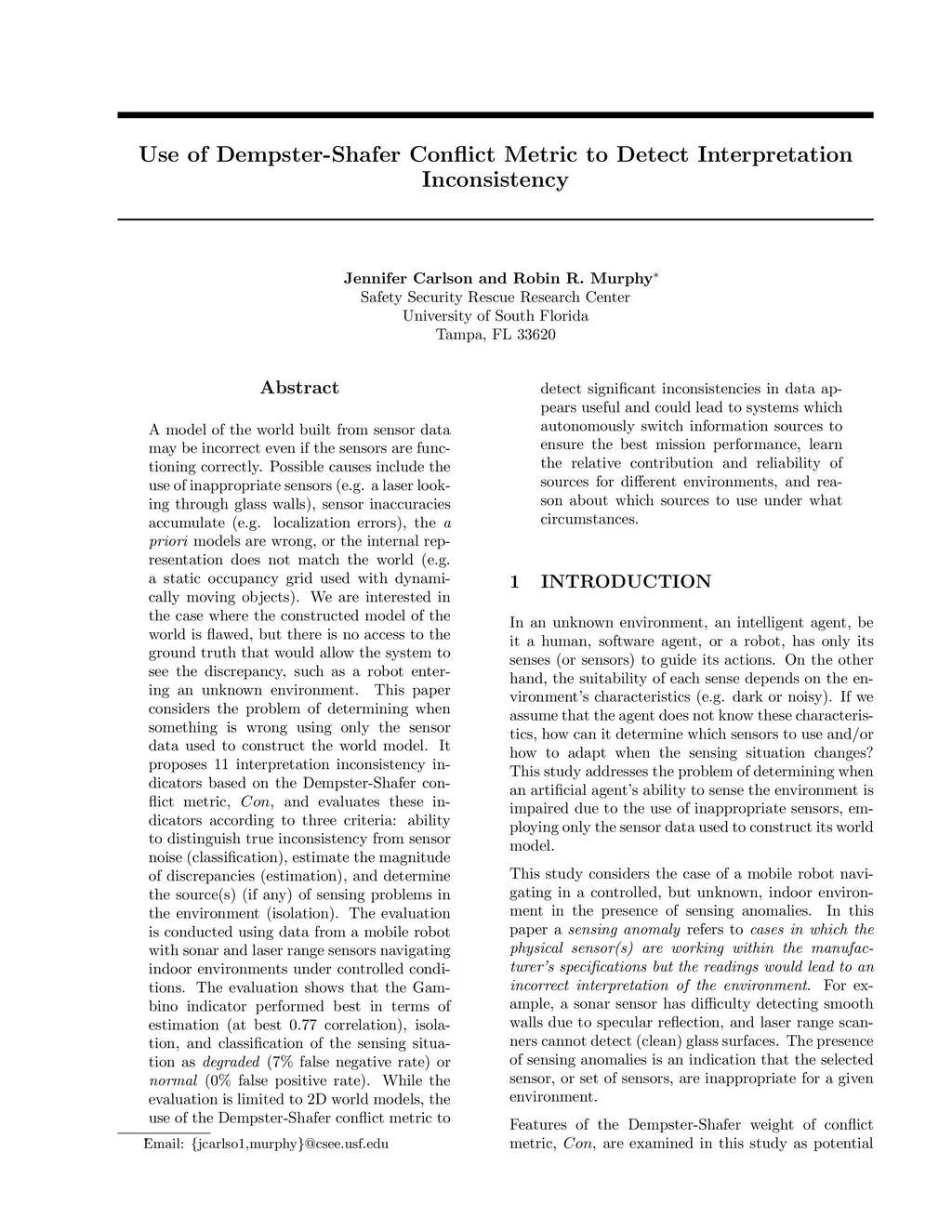 A model of the world built from sensor data may be incorrect even if the sensors are functioning correctly. Possible causes include the use of inappropriate sensors (e.g. a laser looking through glass walls), sensor inaccuracies accumulate (e.g. localization errors), the a priori models are wrong, or the internal representation does not match the world (e.g. a static occupancy grid used with dynamically moving objects). We are interested in the case where the constructed model of the world is flawed, but there is no access to the ground truth that would allow the system to see the discrepancy, such as a robot entering an unknown environment. This paper considers the problem of determining when something is wrong using only the sensor data used to construct the world model. It proposes 11 interpretation inconsistency indicators based on the Dempster-Shafer conflict metric, Con, and evaluates these indicators according to three criteria: ability to distinguish true inconsistency from sensor noise (classification), estimate the magnitude of discrepancies (estimation), and determine the source(s) (if any) of sensing problems in the environment (isolation). The evaluation is conducted using data from a mobile robot with sonar and laser range sensors navigating indoor environments under controlled conditions. The evaluation shows that the Gambino indicator performed best in terms of estimation (at best 0.77 correlation), isolation, and classification of the sensing situation as degraded (7% false negative rate) or normal (0% false positive rate).