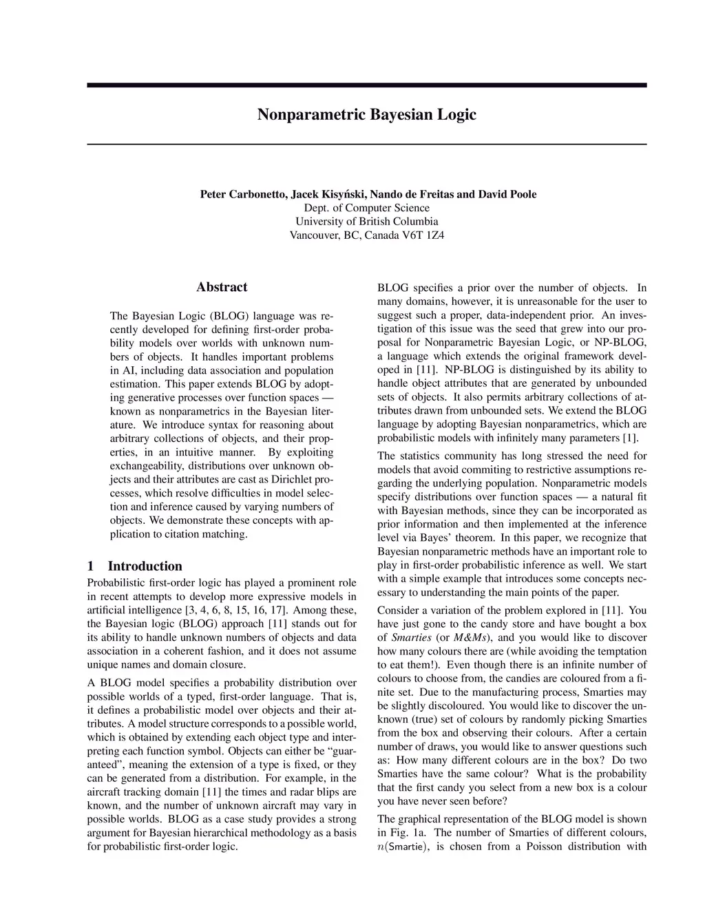 The Bayesian Logic (BLOG) language was recently developed for defining first-order probability models over worlds with unknown numbers of objects. It handles important problems in AI, including data association and population estimation. This paper extends BLOG by adopting generative processes over function spaces - known as nonparametrics in the Bayesian literature. We introduce syntax for reasoning about arbitrary collections of objects, and their properties, in an intuitive manner. By exploiting exchangeability, distributions over unknown objects and their attributes are cast as Dirichlet processes, which resolve difficulties in model selection and inference caused by varying numbers of objects. We demonstrate these concepts with application to citation matching.